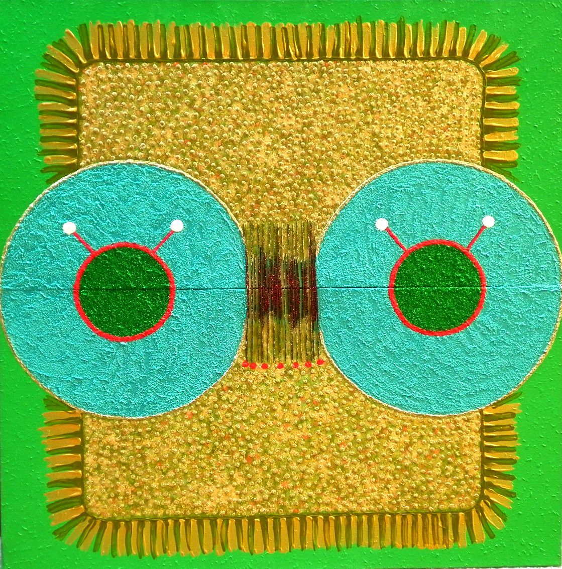 "È evidente la volontà solare e giocosa - spiega la curatrice Francesca Barbi Marinetti - nella scelta di acrilici e smalti accesi, nonché il richiamo a poteri apotropaici nell’utilizzo di glitter, lamé, nastri, piccole icone, oggetti raccolti e conservati lungo la via. Le opere di YaTii sono tutte composte da due tele unite da una cucitura centrale che è il fulcro d’energia creativa che si sprigiona. La cucitura rappresenta la ricerca d’equilibrio nella coesistenza di elementi contrari. L’armonia si attiva dal segno giocoso e vitale di forme prevalentemente circolari, comprensive e protettrici. Un codice che nell’immaginario dell’artista giunge da lontano per comunicare apertura, sorrisi, conforto, sincerità e amicizia".
