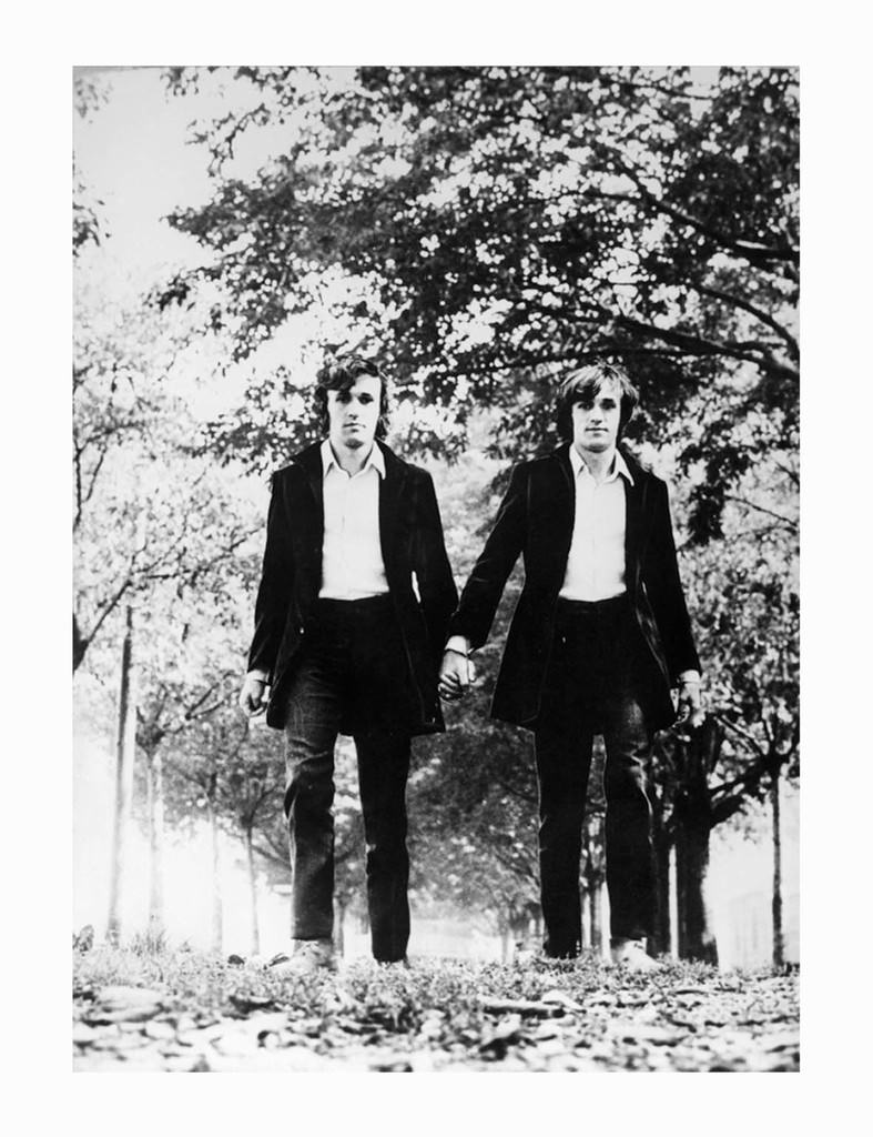 “Insicuro Noncurante” è un portfolio di 81 pagine numerate che rappresentano il lavoro di Alighiero Boetti dal 1966 al 1975. Il lavoro comprende forme differenti, dagli schizzi originali e collages, così come cartoline e lettere. L’invito che raffigura la pagina n. 9 mostra il fotomontaggio “Gemelli”, che può essere considerato programmatico di un aspetto principale del processo artistico e di pensiero di Boetti. L’immagine visualizza la separazione e lo sdoppiamento della propria personalità che l’artista porta a compimento nel cambio del suo nome in Alighiero & Boetti. In questo modo egli estende la propria percezione del mondo come ordine bipolare, nel quale gli opposti interagiscono in ordine sintetico.