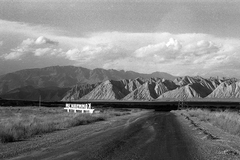 Un bianco e nero straordinario mostra la prospettiva all’infinito di un asse stradale asfaltato in mezzo ad un superficie ampia e vuota che ricorda la steppa. Di fianco a sinistra l’insegna isolata, in cemento e a caratteri cirillici, della parola COMUNISMO che possiamo leggere solo rovesciata. Il rapporto tra le parole e le cose (potremmo dire) è qui un miraggio: l’effetto della differente rifrazione dei raggi luminosi. L’orizzonte su cui l’immagine si apre è, di fatto, quello naturale e immenso della catena del Tien-Shan.