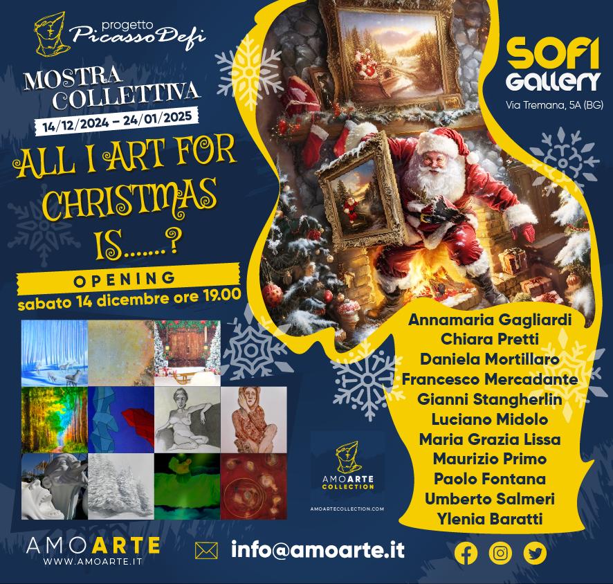 La mostra collettiva ALL I ART FOR CHRISTMAS IS.....? inaugura sabato 14 dicembre alle ore 19.00 presso la Soli Gallery di via Tremana 5A (BG) e sarà un momento molto sentito, non solo perchè coinciderà con il primo anniversario della fondazione della galleria, ma anche perchè sarà un momento particolare di incontro e di scambio culturale contornato dal1'atmosfera magica del Natale.