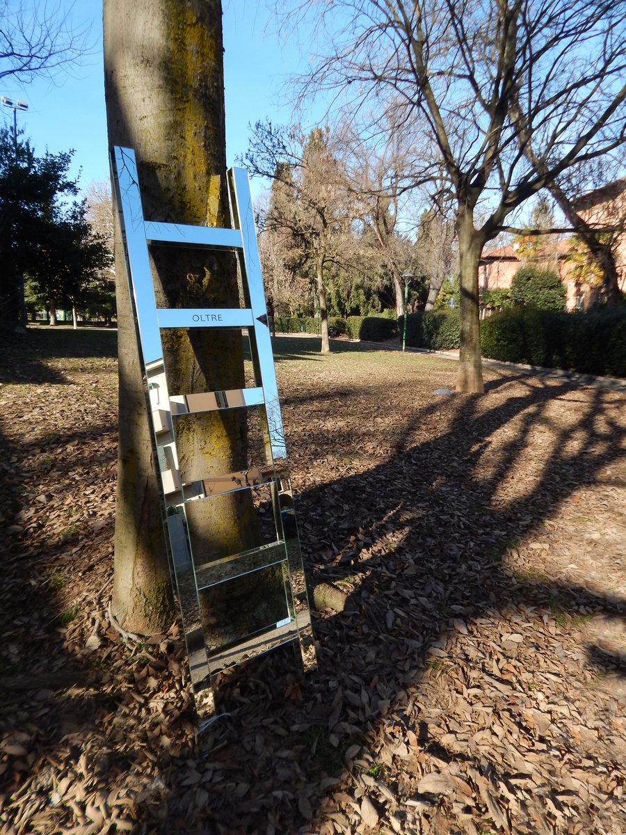 Il duo Antonello Ghezzi è formato da Nadia Antonello (Cittadella, 1985) e Paolo Ghezzi (Bologna, 1980), che dal 2009 realizzano installazioni e performance in contesti italiani ed internazionali. La loro ricerca si focalizza sulla leggerezza e la magia. Giocate su più livelli, le opere esposte al Museo Guadagnucci si modificano ad ogni visione, facendo uso di materiali specchianti. Dal riferimento all’immaginario collettivo dei bambini e ai desideri più profondi – presenti nelle tre coppie di altalene intitolate Spingiamoci Oltre, Tienimi Forte e Sempre Insieme – fino alla scala per andare Oltre e avvicinarsi al cielo.