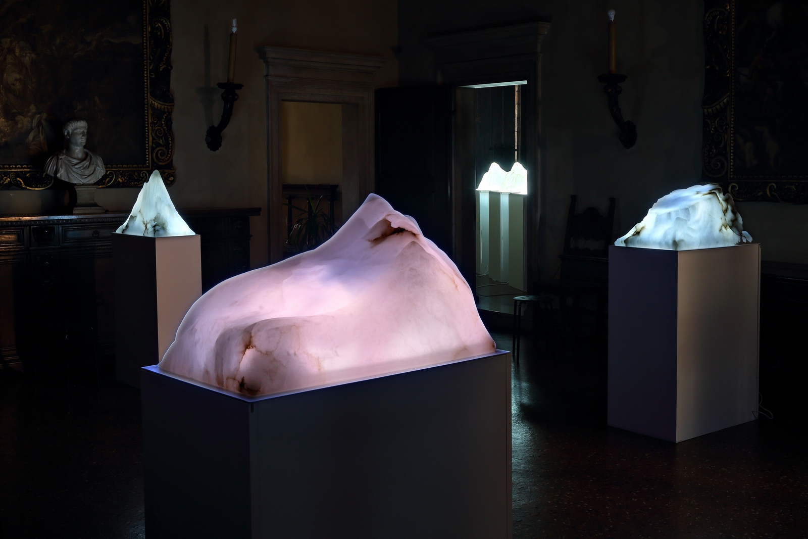 Aqua Aura (Vimercate, 1969) è lo pseudonimo di un artista che ricerca il Sublime nell’epoca contemporanea. Al Museo Guadagnucci affronta il tema della “relazione” con l’ambiente circostante e in particolare con il parco della Villa, esponendo tre video sculture in alabastro della serie Shelters – On The Very Nature Of Light. Opere che propongono una riflessione sul rapporto Uomo/Natura, a partire dalla registrazione di un’intera giornata sub-artica, custodita in capsule del tempo in forma di iceberg: dal cielo mattutino, pieno di luce e di nuvole bianche, alla sua trasformazione in un cielo tempestoso, fino all’imbrunire e al buio della notte, che sprigiona le luci di un’aurora boreale.