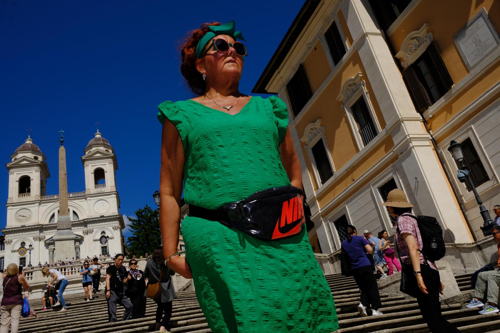 L’occhio di Flora punta l’obbiettivo sul turista “mordi e fuggi” che invade gli angoli della capitale. Come un segugio, si fa strada silenziosamente in mezzo alla gente; punta il bersaglio, il soggetto giusto (quello dalla “bella faccia”, direbbe) e, senza concedersi indecisioni, scatta la foto, conscio che non avrà una seconda occasione. La pratica fotografica di Flora non ammette esitazioni, ricerca l'hic et nunc e lo cristallizza in un flash. È proprio il lampo di luce emesso dal dispositivo della sua macchina che, colpendo il soggetto, finisce per tradire il suo agire apparentemente inosservato tra la folla di turisti. L’uso del flash, all’aperto e in pieno giorno, accentua i colori e la brillantezza delle immagini, restituendo ai lavori di Flora la cifra espressiva che li contraddistingue. I soggetti catturati dal suo obbiettivo hanno pose innaturali, spesso goffe, espressioni caricaturali, a tratti grottesche che sollevano ilarità allo sguardo. La fotografia di Flora è autentica, cinica, quasi spietata: spietatamente beffarda. Un’estetica “opportunista” popolata da soggetti inconsapevoli «è paradossale, si scusano sempre temendo di essere di intralcio nell’inquadratura, ignari che siano loro stessi i protagonisti dei miei scatti.» (ipse dixit)