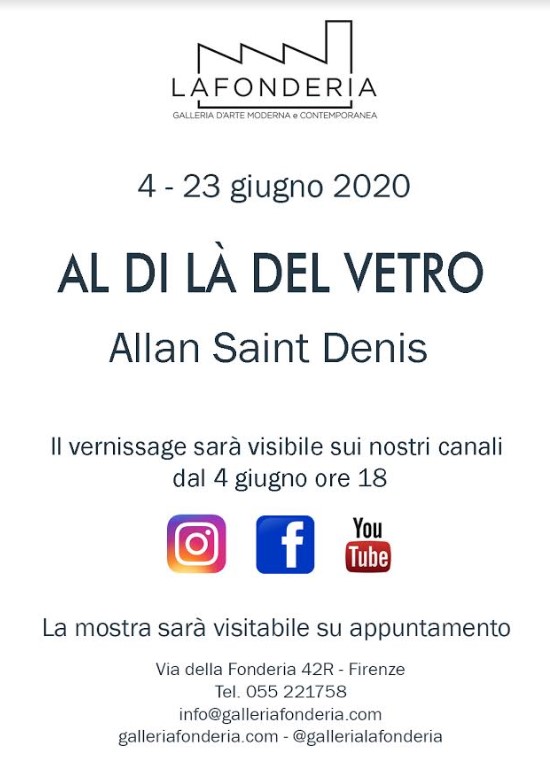La mostra “Al di là del vetro” di Allan Saint Denis verrà inaugurata, il 4 giugno 2020 alle ore 18.00, con una videoripresa che andrà online sui canali Instagram, Facebook e YouTube e che racconterà l’essenza della Galleria La Fonderia nata come fucina di arte e idee che si esprimono attraverso percorsi creativi di grande spessore.