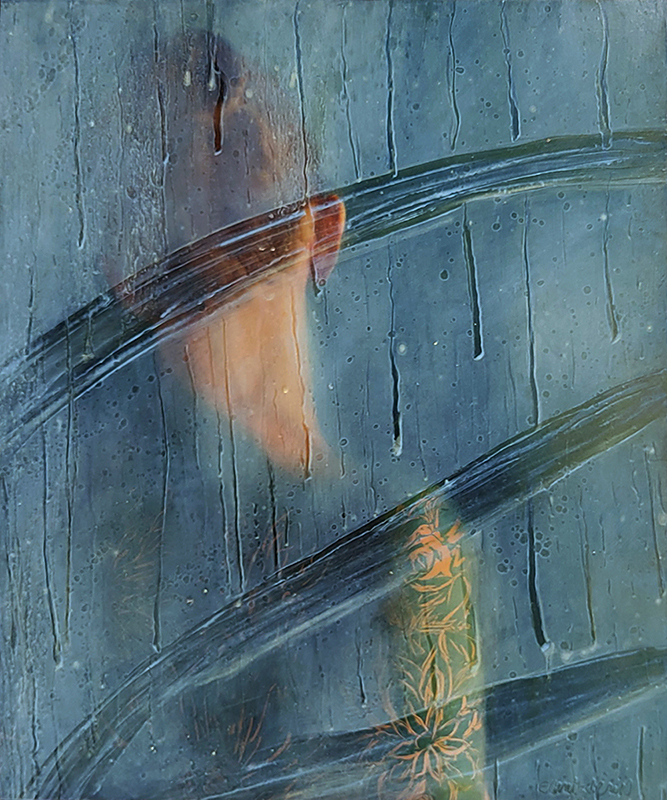 "Il velo per me" ci racconta l'artista "crea un mistero nei miei dipinti che altrimenti sarebbe troppo evidente. Il vapore è una metafora delle sfaccettature che tutti portiamo dietro, quelle maschere dietro le quali tutti ci nascondiamo. Eliminare la nebbia consente di rivelare la verità nascosta. Il mio lavoro si basa sul realismo e, come tale, lo strato nebbioso posiziona il soggetto in uno spazio definito, che si tratti di una doccia o dietro una finestra piovosa."