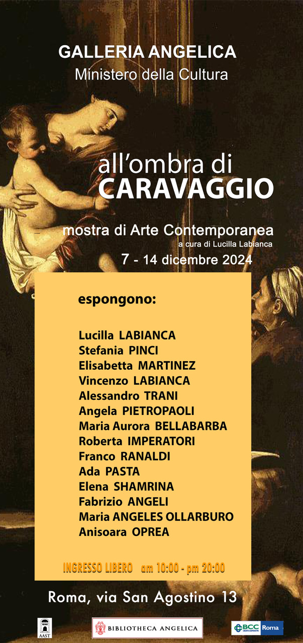 Nell’elegante galleria Angelica in via di Sant’Agostino 13, un luogo prestigioso, in una zona centrale di Roma assai suggestiva, si terrà la mostra di Arte Contemporanea dal titolo: all’ombra di CARAVAGGIO a cura di Lucilla Labianca.