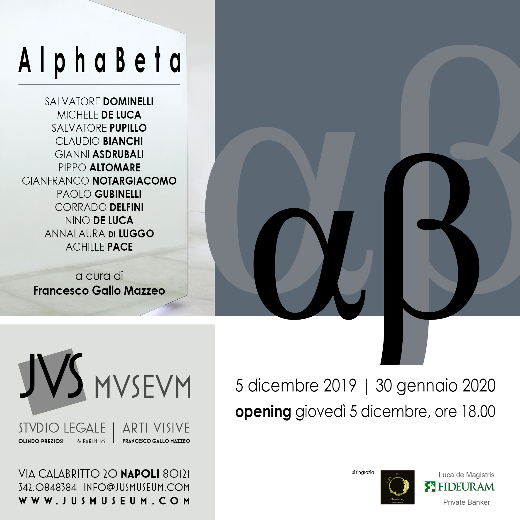 Giovedì 5 dicembre 2019 alle ore 18.00 presso lo Jus Museum (Via Calabritto 20) si inaugura la mostra “AlphaBeta” a cura di Francesco Gallo Mazzeo.