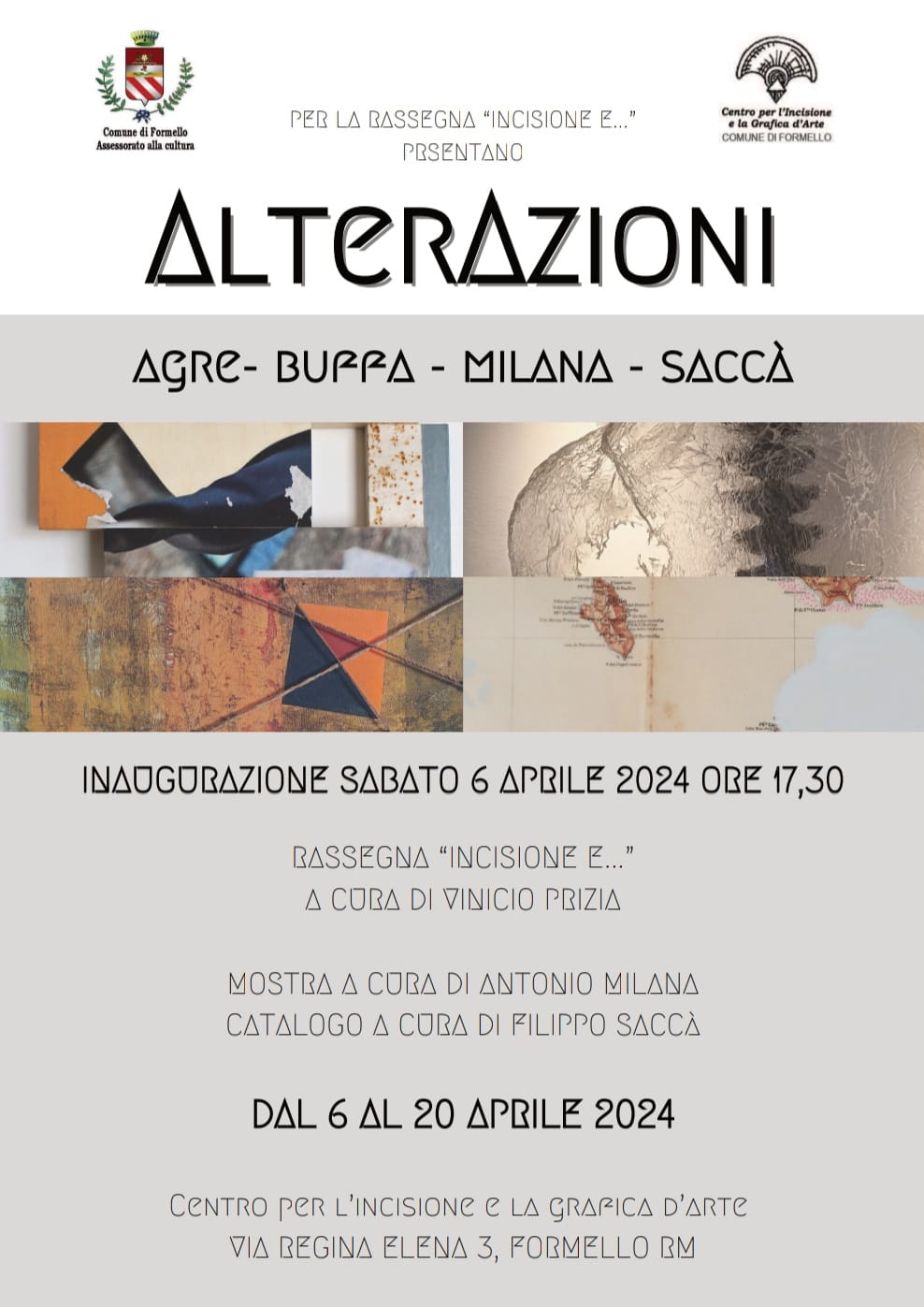 L’inaugurazione della mostra “Alter_Azioni” si inaugura sabato 6 Aprile 2024 alle ore 17.30 presso il Centro di Incisione e Grafica d’Arte di Formello (RM) sito in via Regina Elena n. 3. Espongono gli artisti Antonio Agresti, Laura Buffa, Antonio Milana e Filippo Saccà L’esposizione proseguirà fino al 20 aprile 2024 - orario dalle 16.00 alle 18,30. La mostra è a cura di Antonio Milana e Vinicio Prizia.