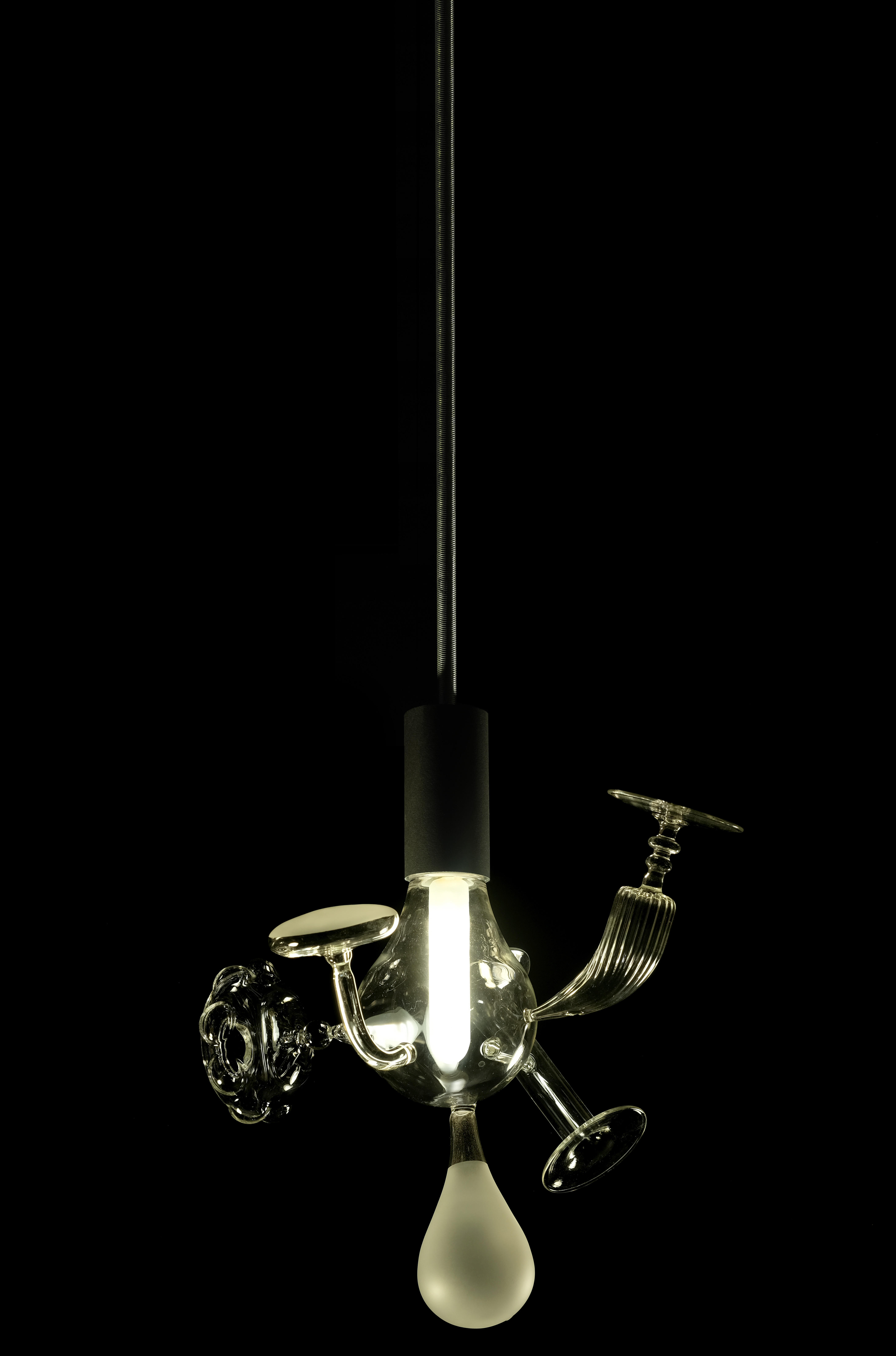 Al centro dello spazio, l'installazione UNSERIAL.bulbs (2021) dei Martinelli Venezia è costituita da una serie di lampade di nuova produzione. Queste sculture luminose si basano sulla trasformazione di un prodotto di massa estremamente standardizzato, la lampadina a bulbo, in un manufatto artigianale unico, frutto della sperimentazione di differenti forme soffiate, satinate o rigate e poi saldate tra di loro in composizioni dall'equilibrio asimmetrico.