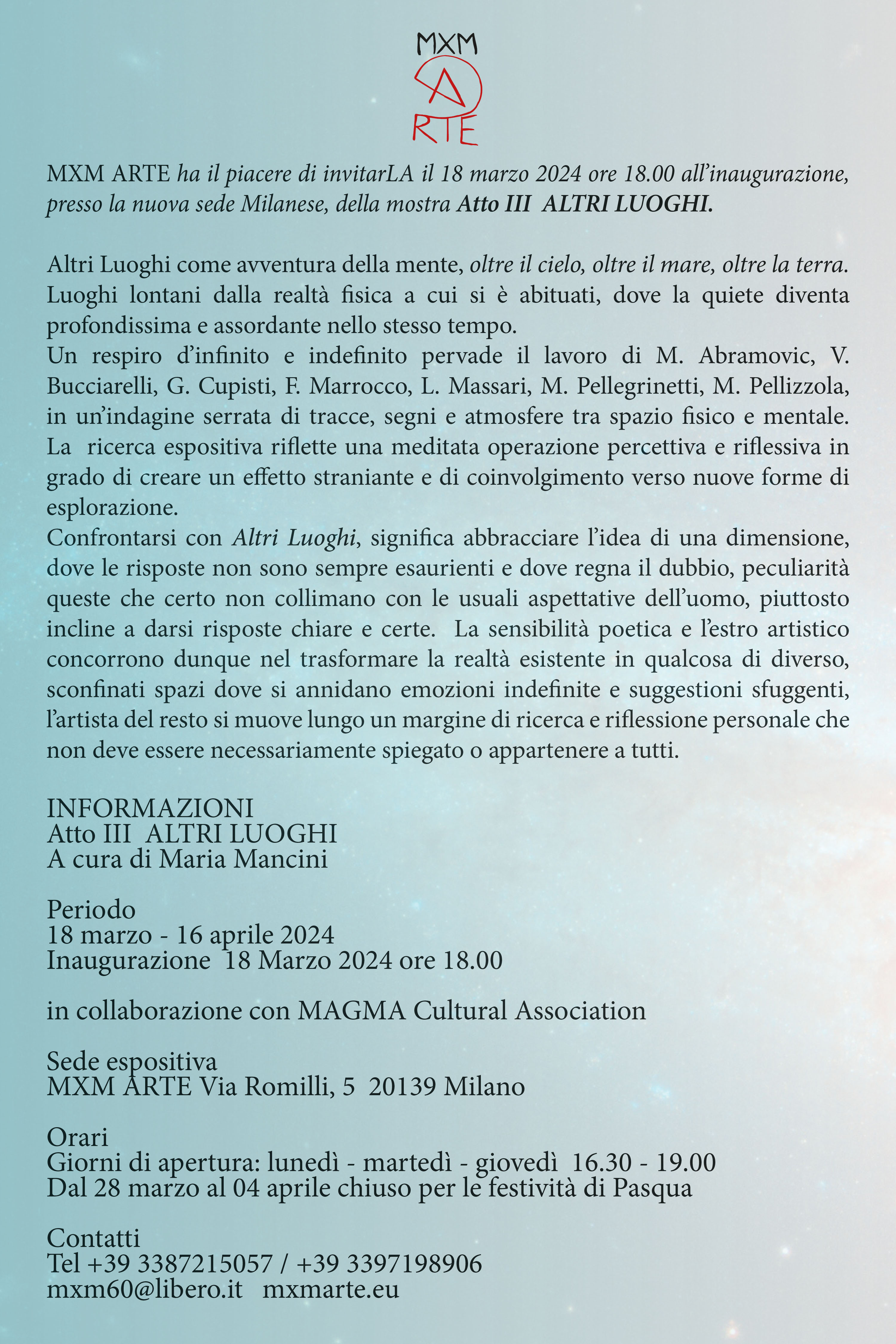 Confrontarsi con Altri Luoghi, significa abbracciare l’idea di una dimensione, dove le risposte non sono sempre esaurienti e dove regna il dubbio, peculiarità queste che certo non collimano con le usuali aspettative dell’uomo, piuttosto incline a darsi risposte chiare e certe.