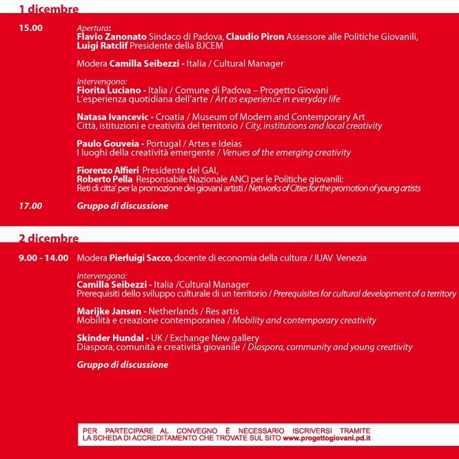 Il convegno è organizzato dall'Ufficio Progetto Giovani – Politiche Giovanili del Comune di Padova in collaborazione con la Bjcem, nell'ambito di ITALIA CREATIVA, programma per il sostegno e la promozione della giovane creatività italiana a cura della Presidenza del Consiglio dei Ministri - Dipartimento della Gioventù in collaborazione con l’ANCI Associazione Nazionale Comuni Italiani e il GAI Associazione per il Circuito dei Giovani Artisti italiani.