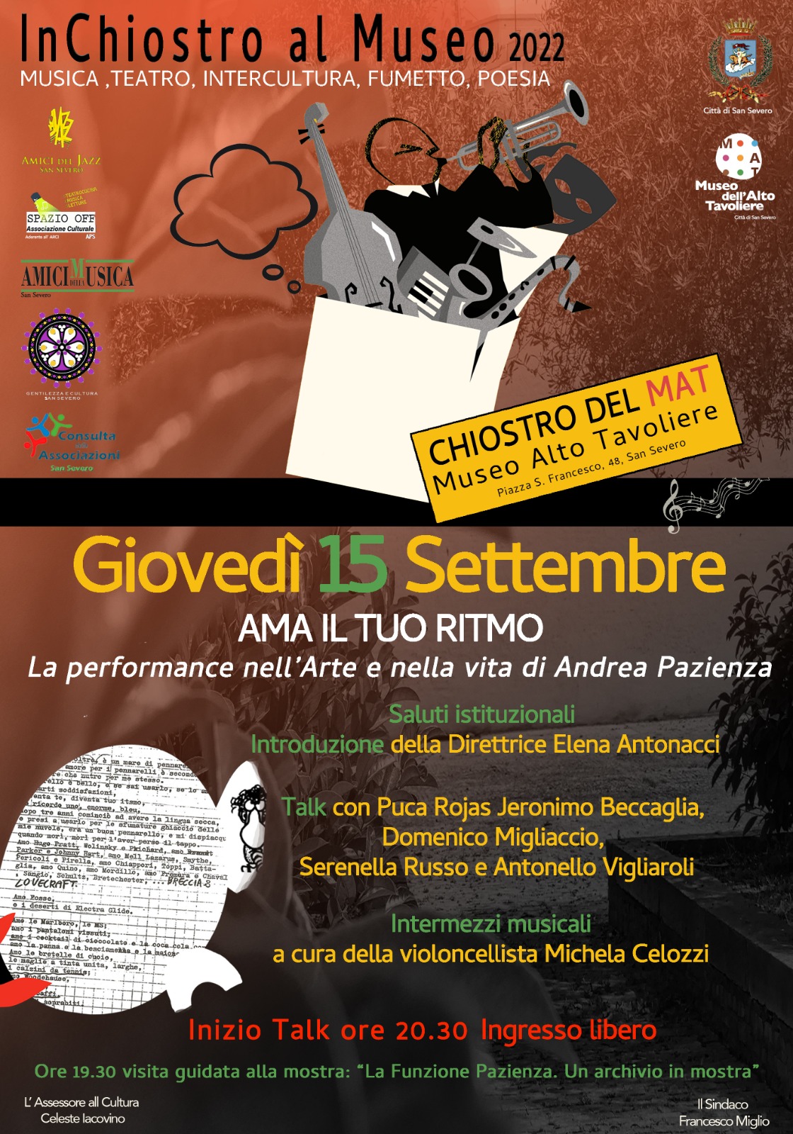 Giovedì 15 settembre 2022, a partire dalle ore 20.30, presso il Chiostro del MAT Museo dell’Alto Tavoliere di San Severo (FG), si svolgerà il talk “Ama il tuo ritmo. La performance nell’arte e nella vita di Andrea Pazienza”, evento finale della fortunata esposizione didattica “La funzione Pazienza.