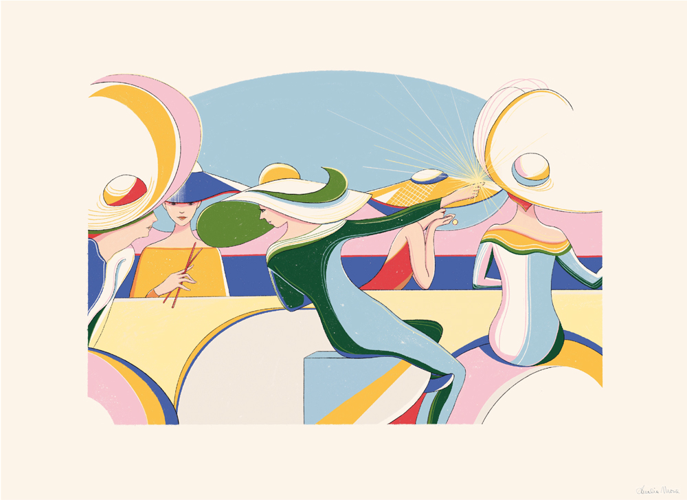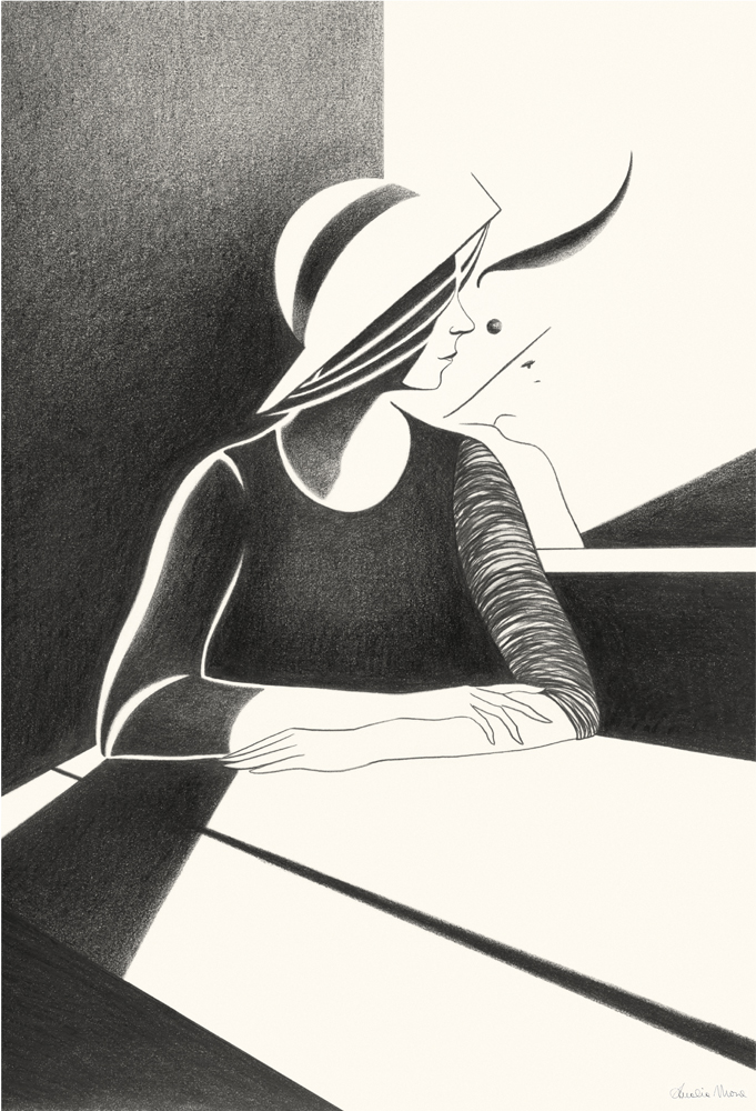 Ad attrarre l’artista sono le linee e le forme di una femminilità posta al di sopra della dimensione terrena che guarda all’ideale di una donna in equilibrio tanto formale quanto psichico. Linee avvolgenti ma decise, chiaroscuri interrotti da campiture dai colori accesi, dettagli come mani, capelli, cappelli hanno spesso un taglio che ricorda un’inquadratura cinematografica, frutto di una personale rielaborazione attraverso il sogno e la capacità di tradurre in segno la metafora.