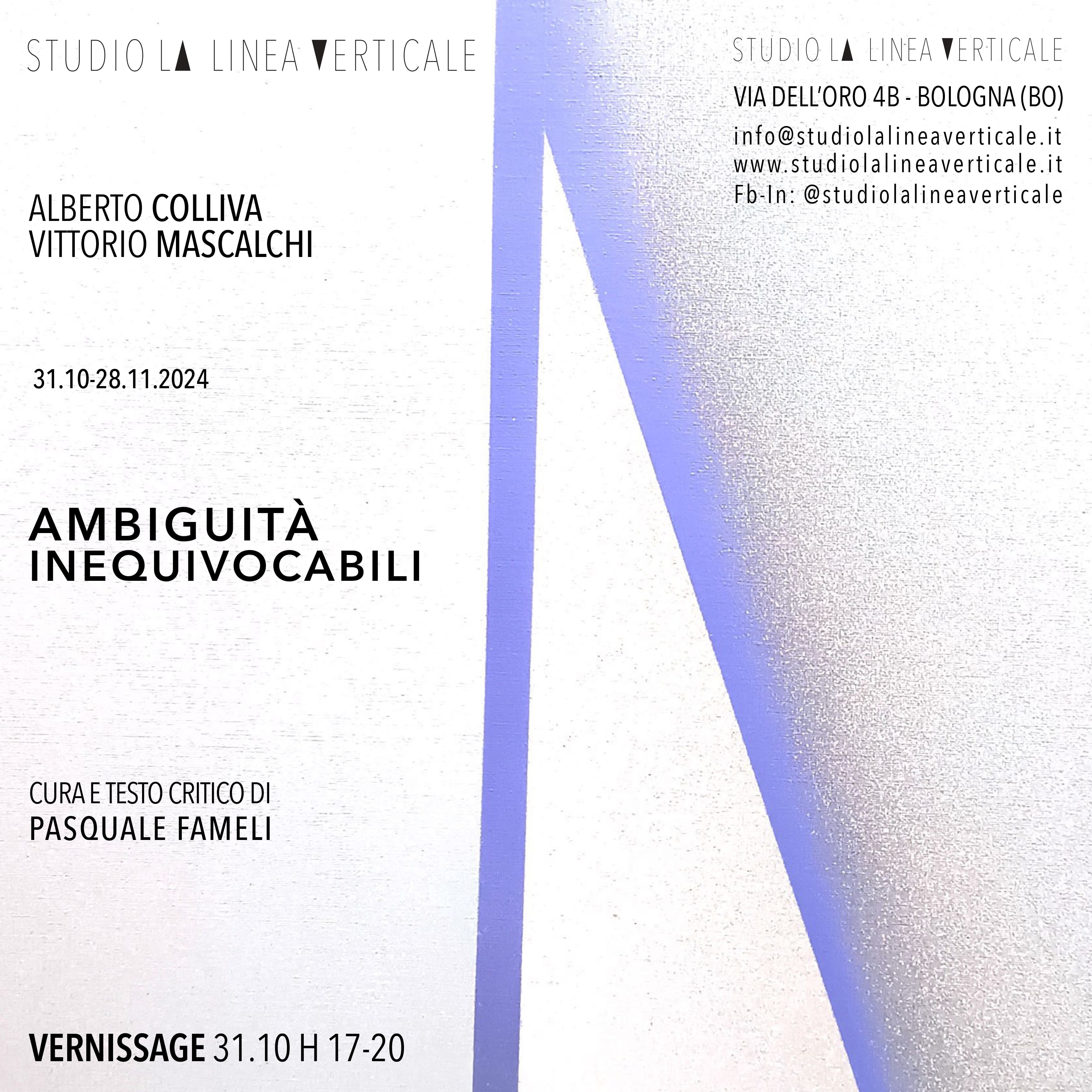 Dal 31 ottobre al 28 novembre 2024, presso Studio la Linea Verticale, si terrà la mostra "Ambiguità Inequivocabili", una preziosa occasione per riscoprire e mettere in dialogo le opere di Alberto Colliva (1943-2023) e Vittorio Mascalchi (1935-2010), due figure di rilievo dell’arte italiana del secondo Novecento. Curata dal Prof. Pasquale Fameli, l'esposizione esplora i percorsi autonomi dei due artisti, evidenziando affinità inattese che emergono con il passare del tempo.