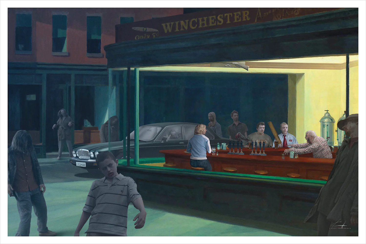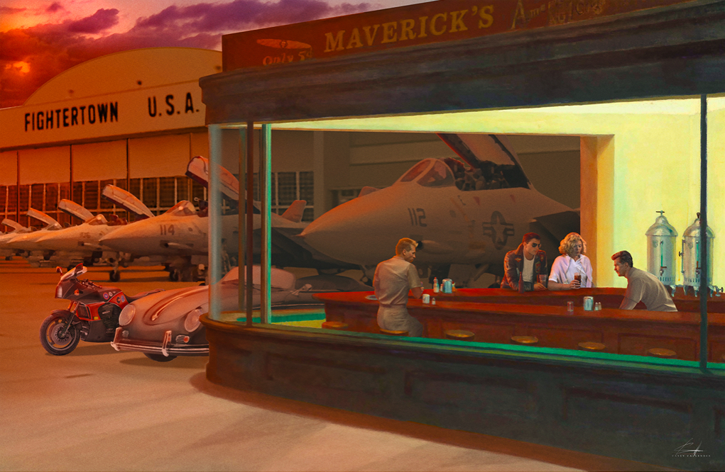 A New York, in particolare a un classico diner americano sulla Greenwich Avenue, si ispira uno dei dipinti più importanti di tutto il XX secolo, Nighthawks di Edward Hopper, opera che trascende il tempo e lo spazio di un pittore che, con le sue opere, ha messo in scena sia l’architettura che i paesaggi, sia reali che dell’anima, che contraddistinguono le infinite sfumature di una paese sfaccettato come Stati Uniti. All’iconica immagine generata da Hopper si ispira l’illustratore texano Casey Callender, che, reinterpretandola, la trasforma in un set cinematografico in grado di accogliere i protagonisti dei film che hanno segnato in maniera indelebile il nostro immaginario, come la scena di un film illuminata dal migliore dei fotografi e arredata dal più meticoloso degli scenografi. Gli “interpreti principali” di questa scena sono seduti al bancone come comuni avventori; non fosse altro che dalla vetrina del locale si intravede in strada la terrificante creatura extra-terrestre di Alien (Ridley Scott), uno degli strampalati esseri che popolando il burtoniano mondo di Beetlejuice, l’iconica Batmobile parcheggiata alle spalle di Batman così come i letali aeroplani pilotati da Tom Cruise in Top Gun. In alcuni casi il locale dipinto da Hopper viene trasportato da Callender interamente in un’altra dimensione: che si tratti della realtà paranormale dei Ghostbusters – a seguito dell’esplosione di Stay Puft, con gli acchiappa-fantasmi ricoperti dalla soffice pasta di marshmellow di cui è fatto il gigantesco ectoplasma – o quella simulata di Matrix – con Neo e Morpheus immersi in un flusso di codici alfa-numerici che compongono quello che noi crediamo essere il mondo reale –, il risultato è sempre incredibilmente affascinante e fonte di infiniti spunti interpretativi per gli appassionati della pittura di Edwardo Hooper e soprattutto del grande cinema.