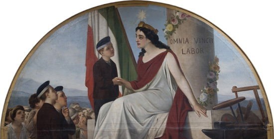 Omnia Vincit Labor si ispira alla storia di Palazzo Santa Margherita, sede della Galleria Civica di Modena, e, in particolare, alla vicenda del Patronato dei Figli del Popolo (dal 1874 ospitato nello stesso Palazzo), e dei suoi piccoli ospiti. L’immagine di partenza è un dipinto anonimo trovato dall’artista nell’archivio del Patronato, dove la figura femminile in primo piano, che sembra evocare la rappresentazione del lavoro o della città, accoglie al suo cospetto alcuni patronatini in divisa.