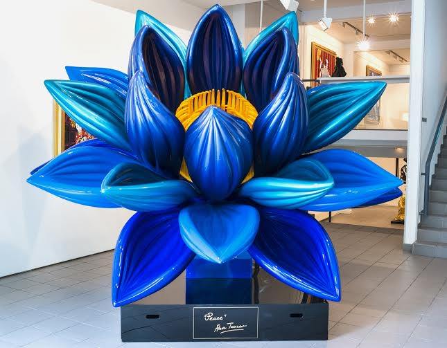 Tra i lavori che più rappresentano queste esplorazioni, figura l’opera centrale della mostra: Peace (2013), una scultura di tre metri e mezzo in vetroresina, raffigurante una ninfea color acquamarina. Come è anche per la sua pittura, questa scultura è un intreccio di forme naturali ed elementi di vita organica reinterpretati in modo fantastico e dilatati nello spazio, con colori amplificati e forme semplificate.