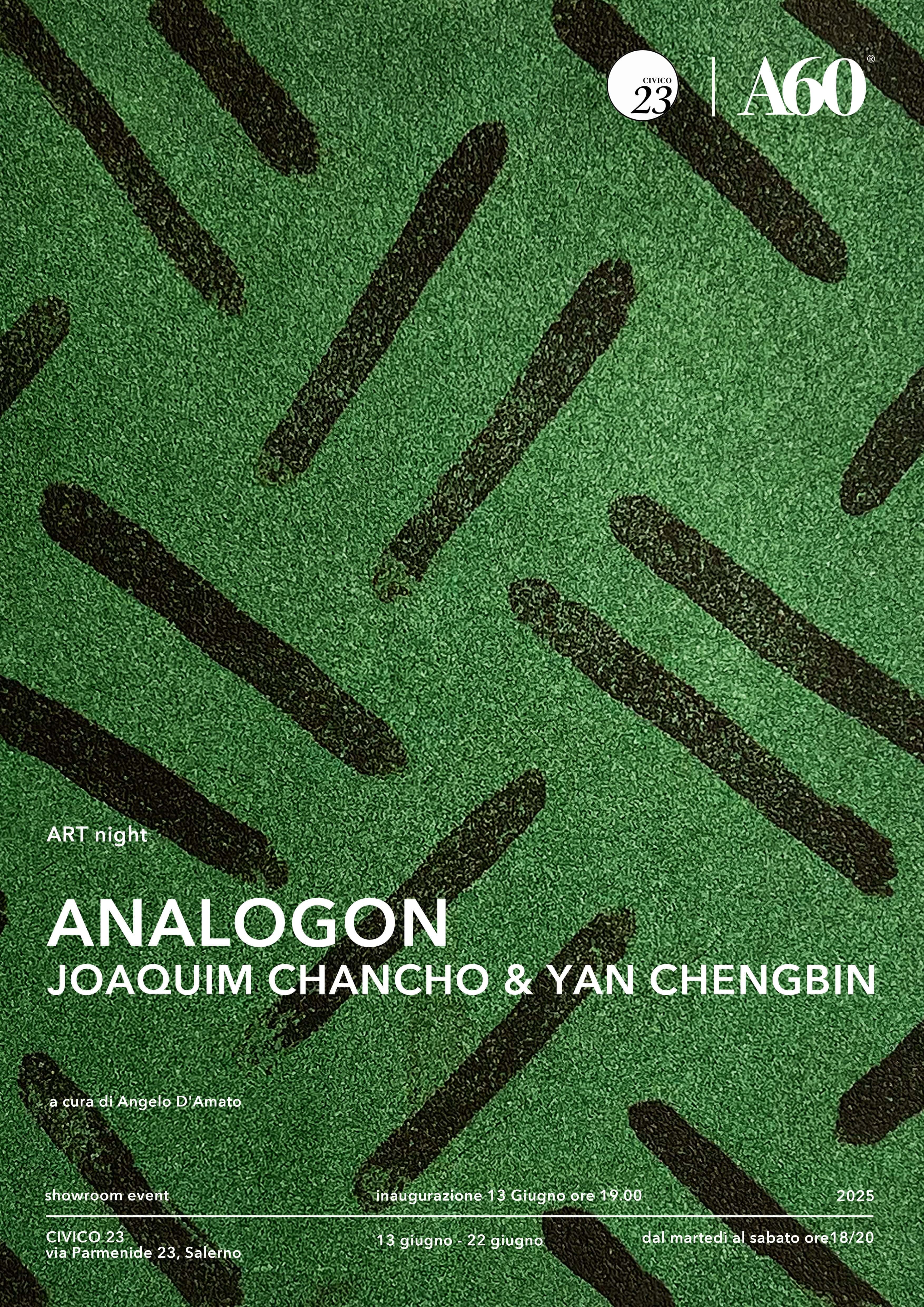 Con la mostra "Analogon" si chiude la stagione espositiva della galleria Civico 23. L'esposizione in oggetto, realizzata in partnership con l’A60 International Art e l'artista/curatore Pengpeng Wang, prevede la presenza di due artisti di alto profilo internazionale, il catalano Joaquim Chancho e l'artista cinese Yan Chengbin.