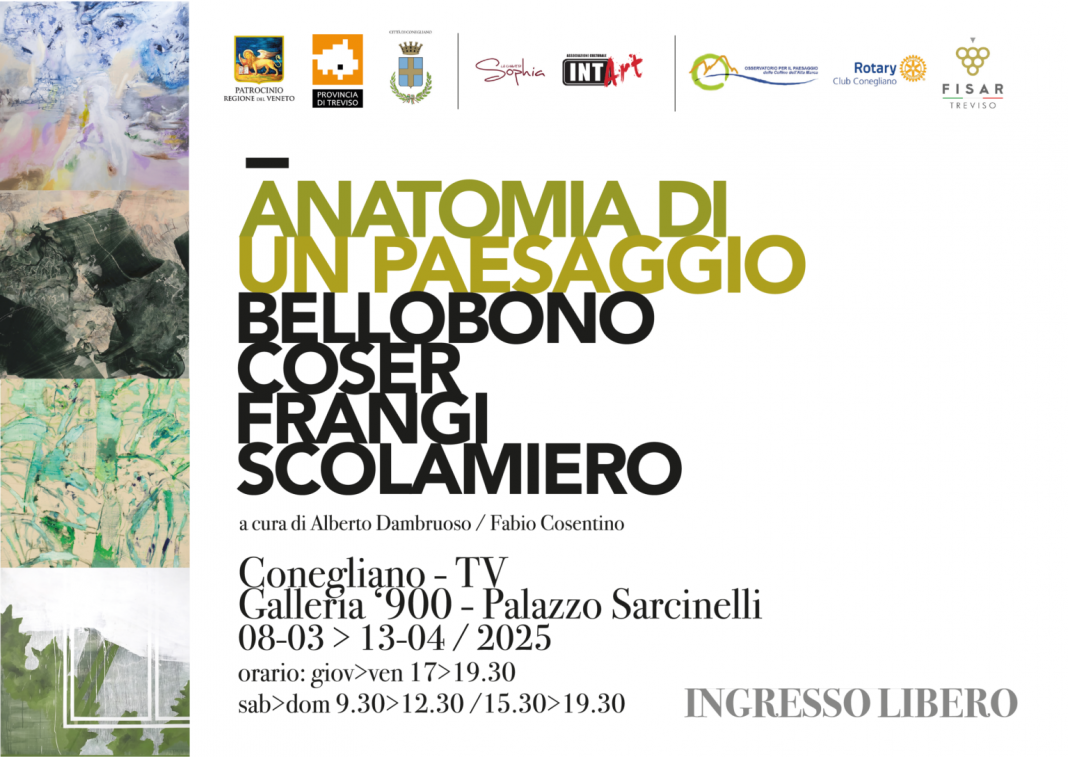 Dall’8 marzo al 13 aprile la Galleria del Novecento di Palazzo Sarcinelli a Conegliano ospiterà la mostra “Anatomia di un paesaggio”, curata da Alberto Dambruoso e Fabio Cosentino, e promossa da La Chiave di Sophia e INTArt. Protagoniste saranno 40 tele di quattro grandi autori contemporanei che interpretano il paesaggio naturale come sguardo verso una dimensione interiore delle nostre esistenze: Angelo Bellobono, Luca Coser, Giovanni Frangi e Vincenzo Scolamiero. L’inaugurazione sarà sabato 8 marzo alle 18 a Palazzo Sarcinelli e vedrà la presenza degli artisti e dei curatori; al termine non mancherà un momento conviviale. Durante l’apertura sono previste visite guidate con i curatori ed eventi speciali. L’esposizione, che sarà visitabile gratuitamente, ha il patrocinio di Regione Veneto, Provincia di Treviso, Città di Conegliano, Osservatorio per il paesaggio delle Colline dell’Alta Marca, Rotary Club Conegliano e Fisar Treviso.