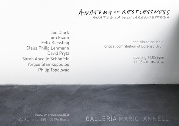 Inaugura mercoledì 11 maggio Anatomy of Restlessness (Anatomia dell’irrequietezza) una collettiva che fa il punto sul percorso di Galleria Mario Iannelli che dopo Berlino è da due anni a Roma.