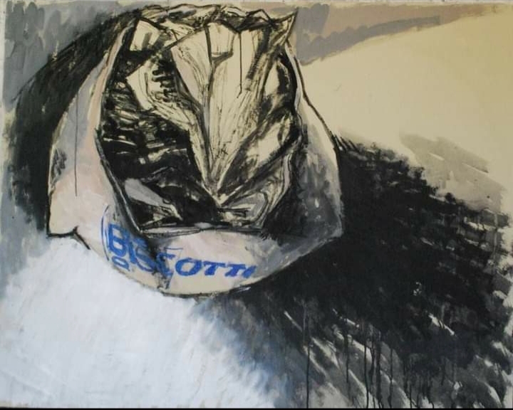 Istintivo, imbrattante, semplificatore dai gesti rapidi Debernardi, nella sua imprecisa definizione, approssima grandemente momenti della vita di ogni giorno presi da riviste, libri, quotidiani. Da questa diversità, così netta nella descrizione, si innesca un’assonanza visiva in cui le rime sono i toni e i gesti. Una sola opera, di grande formato, colori cupi su campo bianco delineano grossolanamente un sacco da cui emerge, in toni blu, evidenti e definiti la scritta ‘biscotti’. Non c’è solarità in questa opera scelta per l’esposizione, ma nulla è a caso poiché è il tratto d’unione di due mondi artistici puntuali ed attenti, meticolosi, inquadrati e squadrati, è l’unico che con la fantasia disfa l’ordine apportando un’altra visione della realtà.