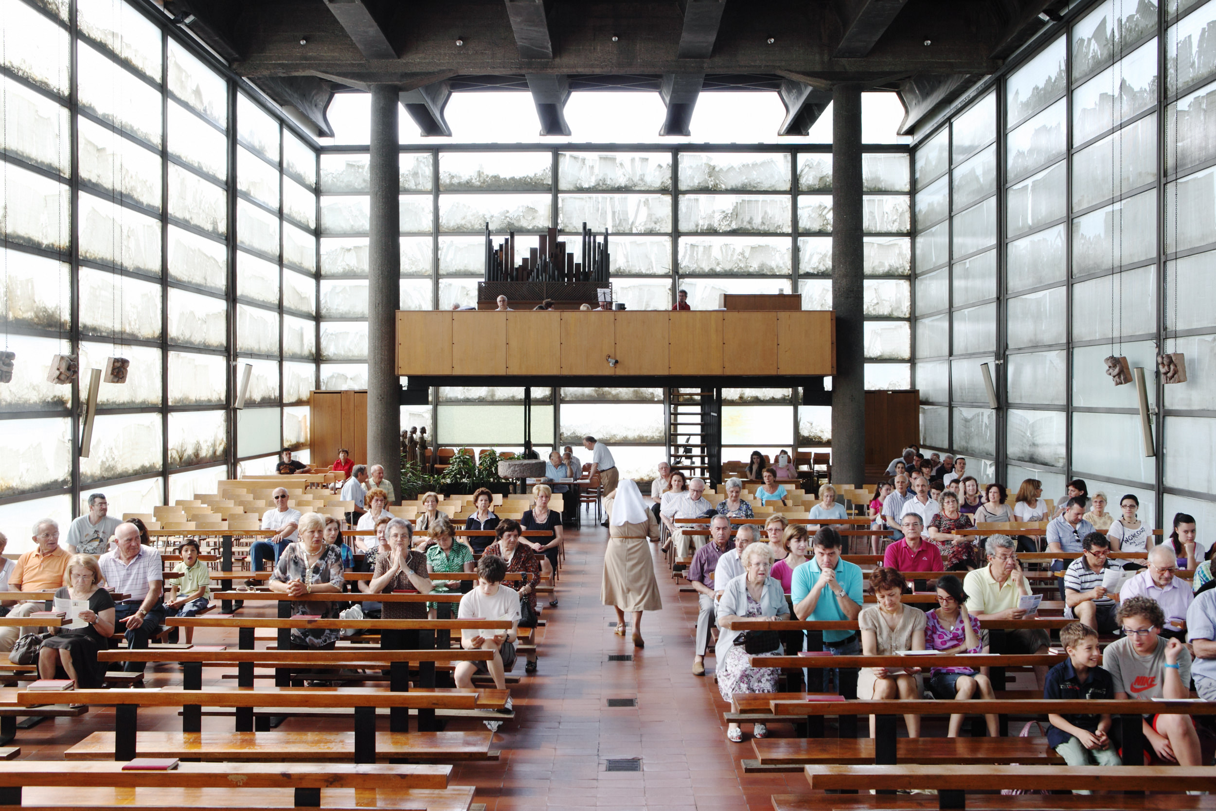 Le fotografie di Giorgio Barrera e Niccolò Rastrelli mostrano una ricognizione delle architetture ecclesiastiche italiane postconciliari, riprese al loro interno. Muovendosi nell’ambito della tradizione documentaria, i fotografi caratterizzano in modo originale la propria ricerca attraverso la scelta di impostare la ripresa secondo un canone fisso, realizzando per ogni chiesa un’unica immagine che assume sempre il medesimo punto di vista (quello del sacerdote dall’altare) e viene eseguita in un preciso momento (quello della funzione sacra). Una scelta dettata da precise ragioni storiche: la riforma liturgica del Concilio Ecumenico Vaticano II ha determinato infatti lo spostamento del sacerdote versus populum, in posizione rivolta verso l’assemblea. Il risultato di questo procedimento sono immagini che, attraverso uno sguardo inedito, propongono una riflessione sul complesso rapporto tra Chiesa cattolica, architettura contemporanea e comunità dei fedeli. Esse sono rigorose vedute architettoniche dell’interno delle chiese, benché ribaltate rispetto al punto di vista abituale, e al contempo un’indagine socio-antropologica, una narrazione dell’Italia di oggi e un ritratto della comunità cattolica. Le fotografie sono state realizzate in numerose città italiane tra cui Roma, Milano, Torino, Firenze, Napoli, Potenza, Avezzano, Taranto, Pescara e includono opere di celebri architetti quali Massimiliano Fuksas, Giovanni Michelucci, Paolo Portoghesi, Mario Botta, Gio Ponti.