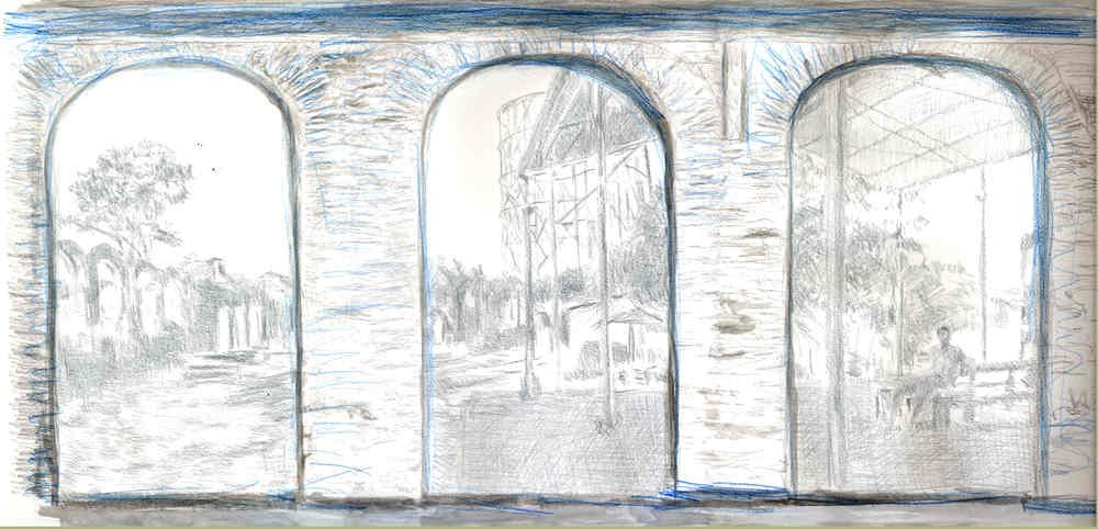 Sulle due arcate laterali un video proietterà in tempo reale le porzioni del paesaggio alle spalle delle arcate stesse. La proiezione sarà sovrapposta al disegno dello stesso paesaggio realizzato dall’artista sulle pareti. Nell’arcata centrale invece il disegno resterà l’unico protagonista.