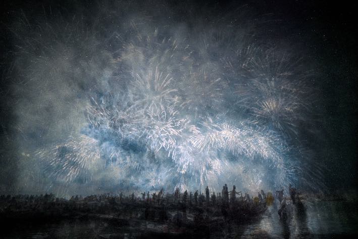 I palazzi di Venezia (Dream 1) diventano caledoscopiche scenografie di un mondo di mezzo, posate su acque che ricordano le luminosità dei dipinti di Davide Battistin. La festa del Redentore (Dream, Red; Dream, Blue) ritrova la