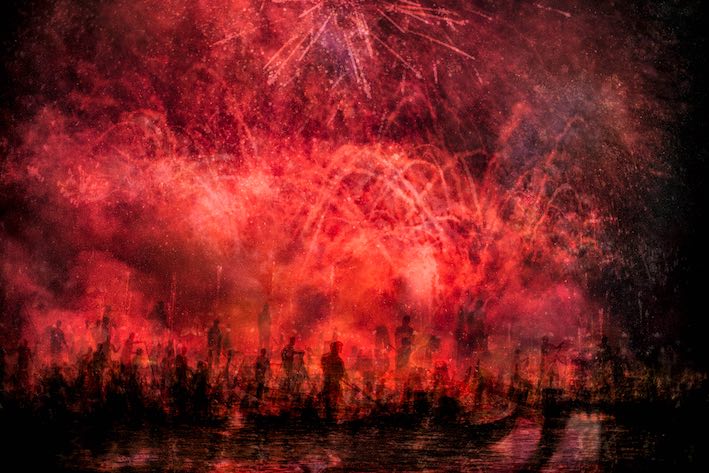 sacralità di rito secolare, un turbinio di anime sospese sulle acque del bacino di San Marco sotto una cascata di fuoco.