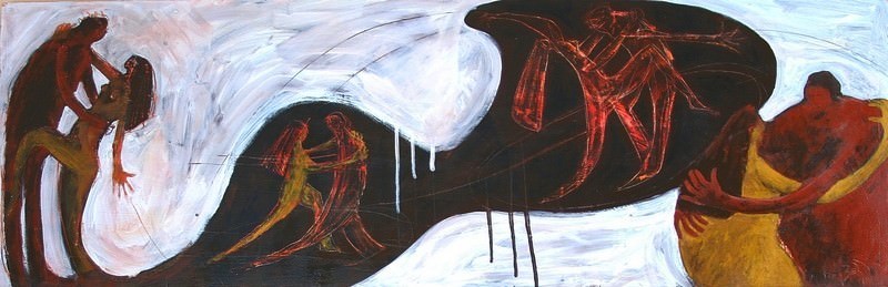 Si sente la musica, il chiacchierio sommesso, il fruscio delle vesti. Si vedono le luci, ichiaro scuri e quasi se ne assaggiano le emozioni. Chi guarda i tanghi di Andrea Bettin si sente trasportato, completamente assorbito dall’atmosfera di una Milonga argentina. Le sensazioni sono forti, i colori avvolgono. E ci si lascia travolgere, diventando protagonisti della scena catturata dall’artista. Un uomo e una donna, un’attrazione sensuale che dura il tempo di un ballo: il tangodiventa l’allegoria del rapporto di coppia. Consapevoli che il ballo, iniziato su unanota, presto finirà su un’altra, si danno, uno all’altro come fosse l’ultima danza, l’ultimo atto d’amore: lei trascina lui, poi lui la guida, come in un amplesso. Passione e coinvolgimento, ma anche sensazione di precarietà. La vita e la morte che si rincorrono, perché tutto ha fine e per questo Eros e Thanatos si muovonoavvinghiati nelle note del tango, ballando sempre come se fosse l’ultima volta. A dare corpo ai quadri una forte cromaticità, ma anche diagonali mal squadrate, appositamente sgraziate, segni forti e decisi che sembrano voler imitare la fatica“indossata” dagli immigrati italo-francesi, che nelle bettole si rifugiavanotrasfigurando la loro rabbia e i lori sforzi in una danza. E inventano il tango, altamanifestazione della creatività popolare, che strada facendo ha raccolto un’infinità di valori e significati, mantenendo sempre intatta la sua essenza e la sua carica emotiva. Il ritmo che unisce le tele del Tango è accompagnato nel percorso espositivodell’opera di Bettin da “altre storie”. Vele, acquari, primi piani, volti di donna per un artista che non si imposta su un genere, ma ne segue diversi, in una continuaricerca artistica, che somiglia molto, così come l’arte stessa, alla ricerca del senso della vita.