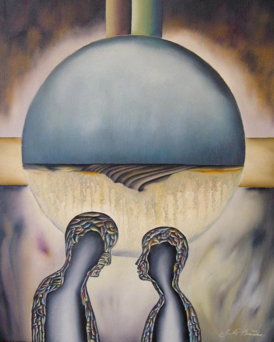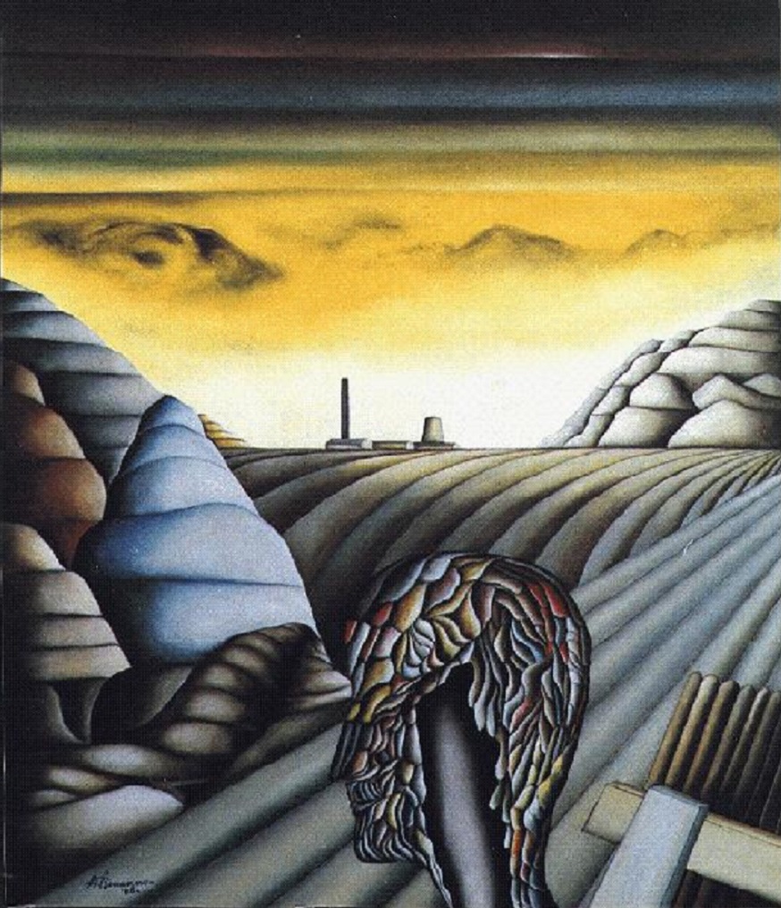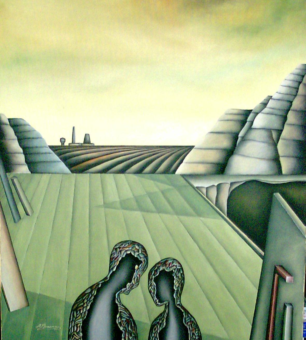 Sono presenze dell’assenza dell’umano che tentano invano di ritrovare la vitalità, di resistere all’immane perdita delle loro funzioni immaginative e critico-riflessive. Le figure convivono in paesaggi desolati, si aggirano in tossici scenari degradati sconvolti da una perdurante azione inquinante da sembrare riflettere anch’essi le stigmate dello sconvolgimento. Quasi sempre, mostrano il lato oscuro di una insolita staticità, in realtà, restano solo delle fugaci apparizioni, con presenze uscite dai loro corpi reali per assumere forme declinanti il vuoto e l’assenza. Stando a questa particolare tematica nel dipingere l’uomo indagata con un acuto atteggiamento “verificale”, riflessivo e critico, viene denunciata l’assenza perduta dell’uomo e l’invito ad un ripensamento, a ritrovare un barlume di riscatto, di possibile liberazione da una condizione che aliena profondamente e degrada profondamente l’uomo, conducendolo alla sua completa destrutturazione e ad una totale negazione della sua precaria e inconsistente condizione umana. Sandro Bongiani.