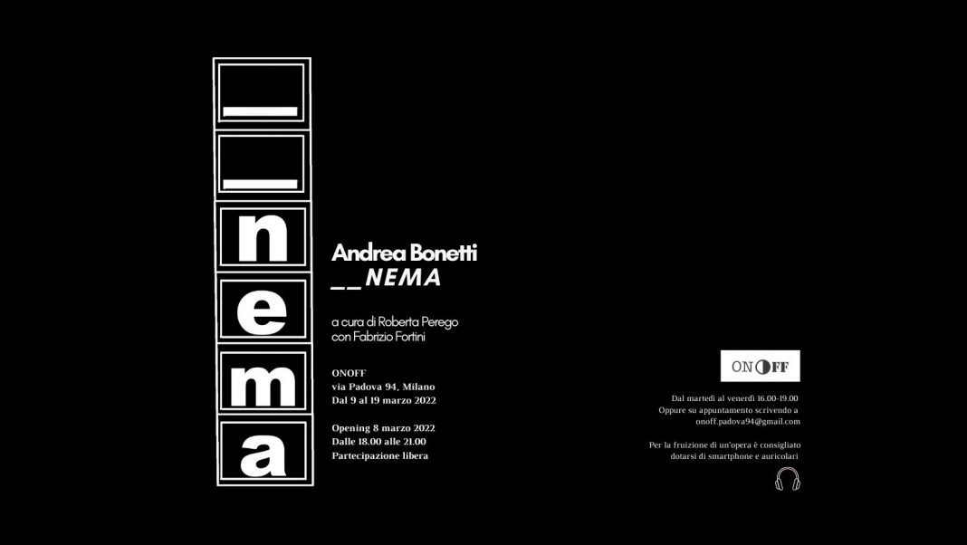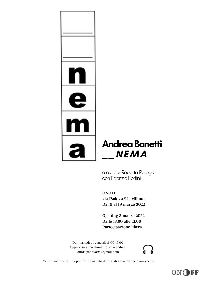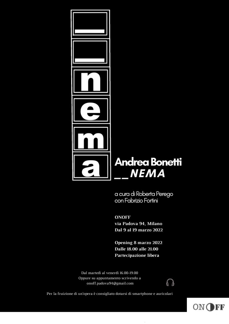 _ _N E M A è la prima personale di Andrea Bonetti. Il progetto espositivo, sviluppato in dialogo con lo spazio di ONOFF e il contesto urbano circostante, presenta un intervento specifico, concepito come il tentativo da parte dell’artista di entrare in relazione con via Padova, luogo a lui pressoché nuovo e sconosciuto. Immaginando ONOFF e la sua vetrina come un campo visivo e di osservazione, Andrea Bonetti vi ha trascorso all’interno ventiquattro ore consecutive contando le persone di passaggio lungo la via. Ogni movimento è stato appuntato sul vetro attraverso dei piccoli tratti neri verticali: un conteggio che restituisce graficamente il via vai in questa porzione di strada - dalla frenesia del giorno ai momenti notturni più rarefatti - in ventiquattro ore di osservazione silenziosa. La mostra include inoltre una selezione di lavori dell’artista, a raccontarne la ricerca nei suoi molteplici sviluppi.