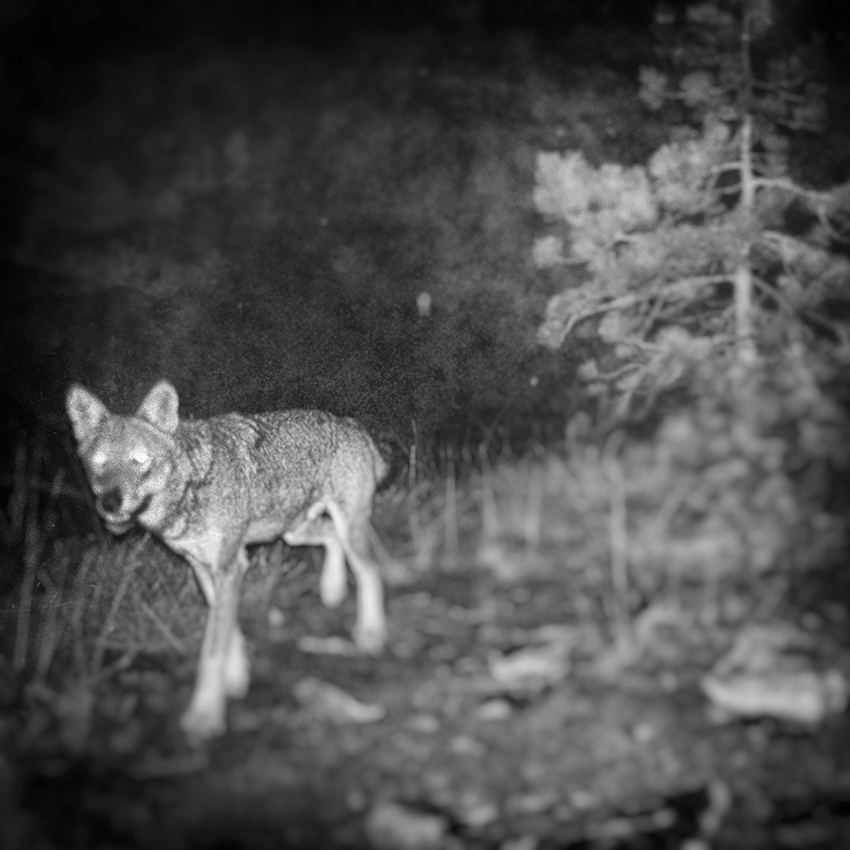 L’allestimento svela un bosco buio, che mette in scena i light-box esposti per la prima volta al pubblico, in dialogo con le immagini allestite lungo le pareti della galleria ― ricoperte da gigantografie boschive ―, in un delicato mostrare di un habitat forestale dove le fotografie realizzate per mezzo di fototrappole, rivelano un mondo che si offre per magia, dando vita a singolari auto ritratti fotografici di animali.