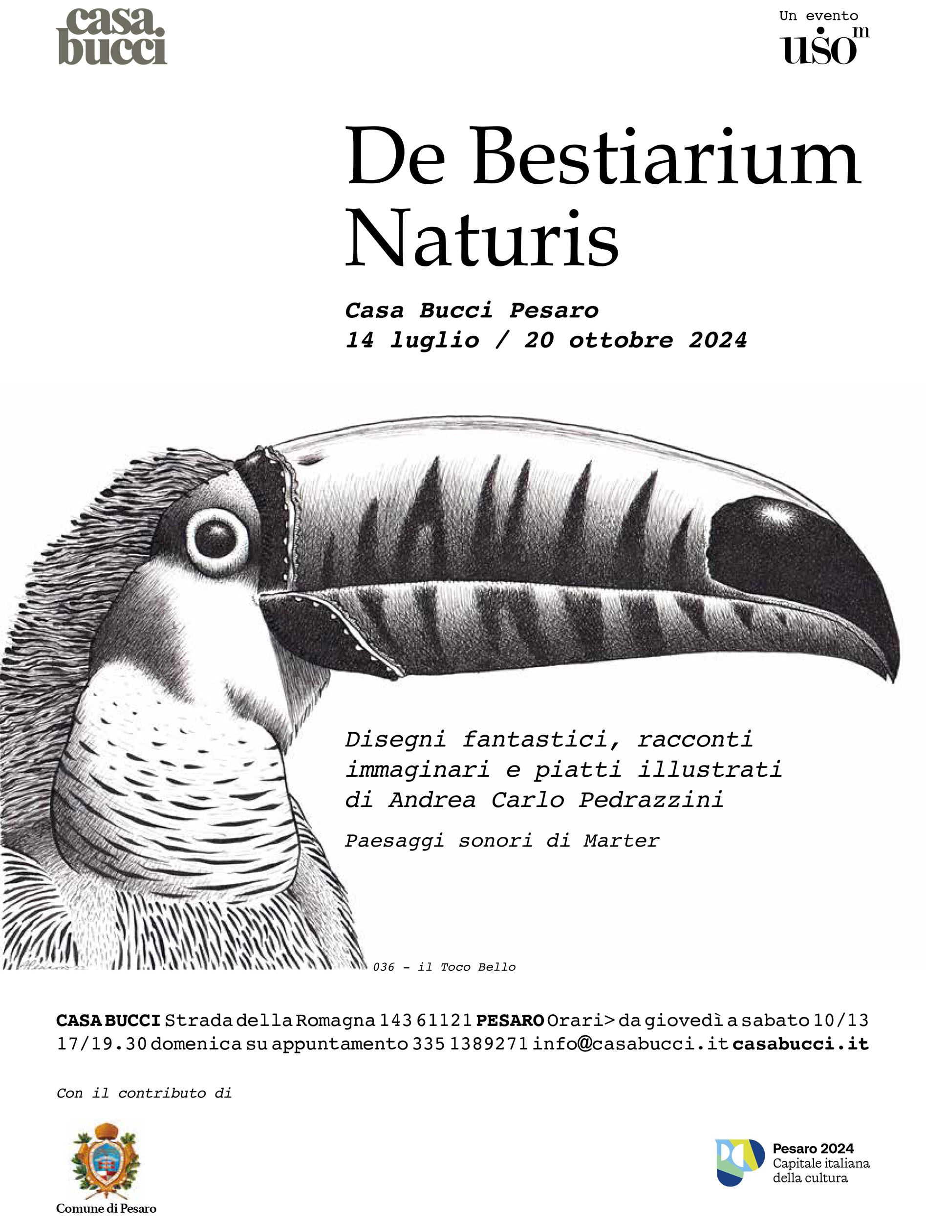 Nell’anno di Pesaro Capitale italiana della Cultura 2024, dal 14 luglio al 20 ottobre, Casa Bucci promuove e ospita la mostra “De Bestiarium Naturis. Disegni fantastici, racconti immaginari e piatti illustrati di Andrea Carlo Pedrazzini”, importante personale, a cura di Viviana Bucci, dedicata ad uno dei più visionari illustratori italiani, collaboratore per anni del geniale imprenditore culturale Gianni Sassi: Andrea Carlo Pedrazzini (Milano, 1958), noto per i suoi lavori per le riviste storiche Alfabeta e La Gola ma anche per il Sole 24 Ore e l’Unità.