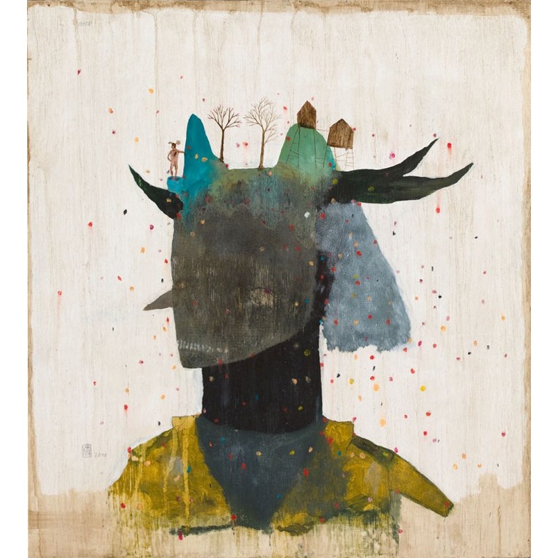 Carpita imbastisce i suoi personaggi con un filo poetico del tutto personale: una natura inattesa e insospettata che affiora là dove meno te lo aspetti: rami d’albero che diventano mani, piedi, un ramo di ciliegio sulla testa di un samurai, un bonsai ai piedi di un guerriero. Eppure ogni cosa sembra ritrovare un ruolo e un tempo vissuto, tutto ritrova una sorprendente normalità. Come quella di sette piccoli alberi sulla cima di un monte appeso alle nuvole. Barbara Musetti