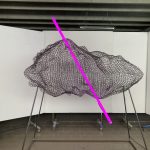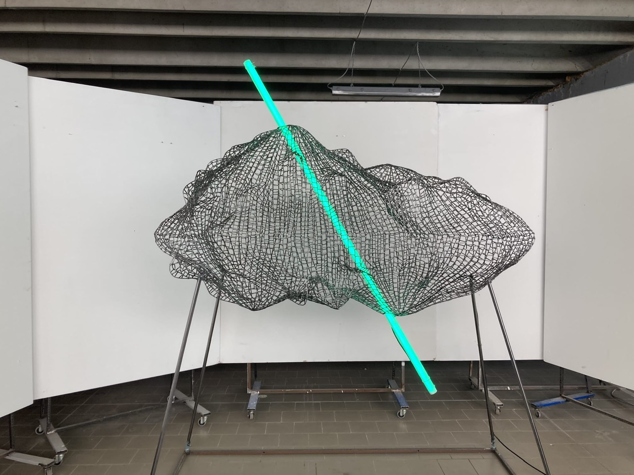 Una nuvola di ferro, galleggia a mezz’aria. Un involucro, un contenitore, un catalizzatore a flusso alternato di pensieri/immagini attraversato da un tubo luminoso. Quasi organismo vivente, la nuvola raccoglie e restituisce quello che capta, che sente, modulandolo in entrata e in uscita con colori diversi, gli stati d’animo appunto, di coloro che intercetta.