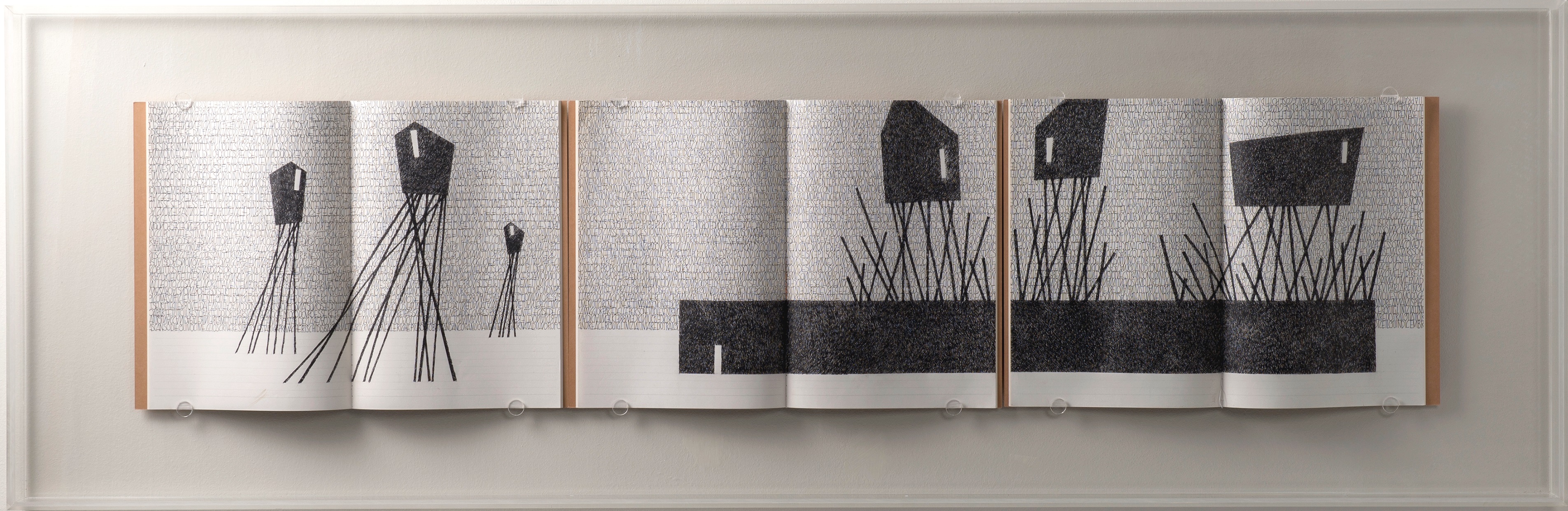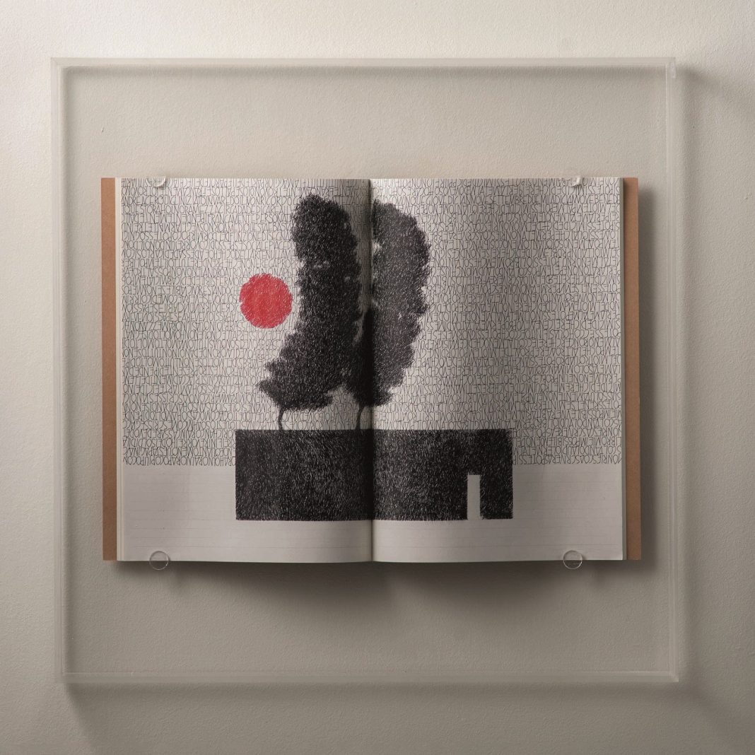 Il risultato è potente, forte e vigoroso, nell’insieme che dialoga ed esalta lo spazio della sala e al contempo dona luce e respiro alle opere. E’ poi interessante constatare che una tale mostra venga messa in scena proprio nella Biblioteca, il luogo che i libri custodisce e diffonde, che si fa ora contenitore e veste di presentazione per dei quaderni mutati in libri d’artista.