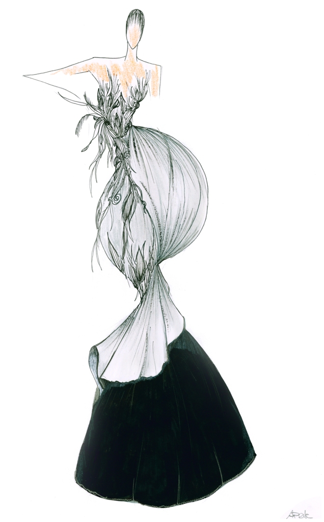 Per Andrea Dalma disegnare e creare abiti è il risultato di un processo creativo che parte dall’osservazione di tutto quello che lo circonda: “In fondo, nella vita, tutto quello che vedo, sento e sogno si trasforma in abiti … Devo impregnare la carta di forme, dei miei sentimenti, dei capricci del momento, mescolare con piumaggi di uccelli: il pavone, l'usignolo, il corvo, l'airone ... cortecce di alberi e la forza dei metalli: ferro, bronzo, rame, oro e vetro”. I suoi “scarabocchi” (come ama definire i suoi lavori) si trasformano in vere e proprie opere grafiche che sono il frutto di “una fusione di colori, forme, plissè ... linee bizzarre, colli che sbocciano come fiori sulla neve, nei rovi, … il mio tormento e la mia ossessione”.