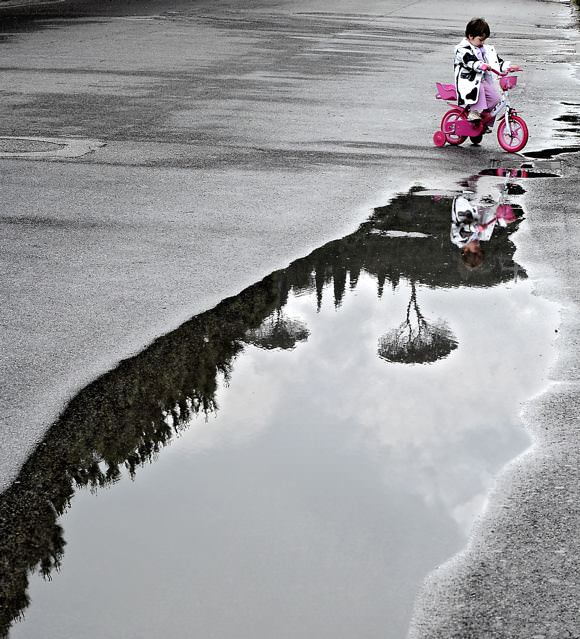Il punto di vista di De Bonis, a volte alzato a volte molto ribassato, non si focalizza sulla folla che colma le strade ma si concentra verso quelle prospettive più silenziose, quella dimensione in cui è possibile ancora ascoltare il rumore di una bicicletta, il suono dei passi veloci sull’asfalto, la quiete dei pensieri nascosti di un uomo, inquadrati in atmosfere di sottile rarefazione che trasformano scenari reali in suggestioni metafisiche.