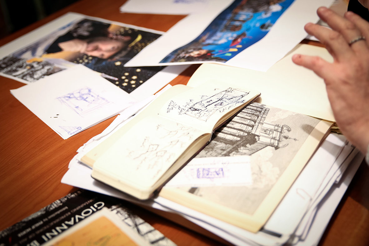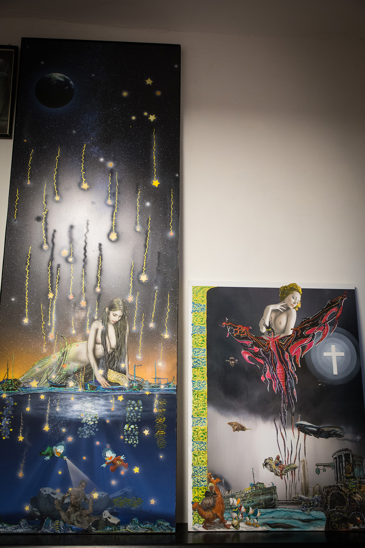 Tra le immagini suggestive di architetture fantastiche è presente, infatti, un’opera ispirata alle sedici tavole di Piranesi dedicate alle “Carceri d’invenzione”, nelle quali enormi sotterranei a volta, con gigantesche scale in pietra, si fondono con possenti macchinari provenienti da un futuro lontano ispirato ai frames dei films di George Lucas, Stanley Kubrick e George C. Scott.
