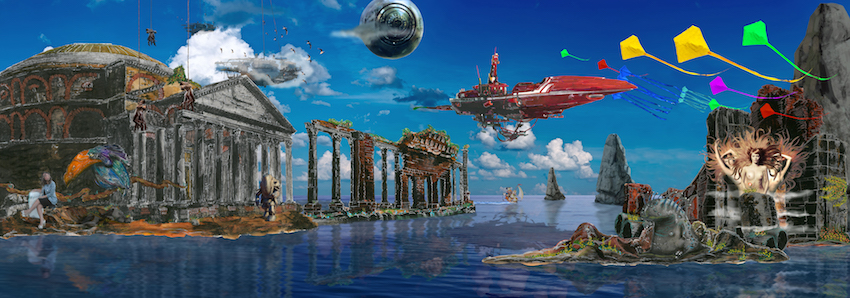 “[...] Fantaworld è un progetto elaborato su una nuova dimensione della realtà, in cui si coniugano più profondità temporali. La rappresentazione è caratterizzata dall’utilizzo di molteplici media artistici: il fumetto, la grafica di Piranesi, la fotografia, il disegno architettonico e paesaggistico del mondo contemporaneo, il video. Il risultato è la visione di un’area del fantastico atemporale, in cui il passato e il futuro si uniscono al formare un continuo presente. E’ la condizione percettiva della nostra epoca, definita e profilata dall’uso di tecnologie multimediali. Un infinito proiettarsi di immagini che incrocia personaggi e momenti della storia con il contesto attuale, creando un continuo spaesamento cronologico assolutamente originale rispetto al sentire dei nostri antenati.