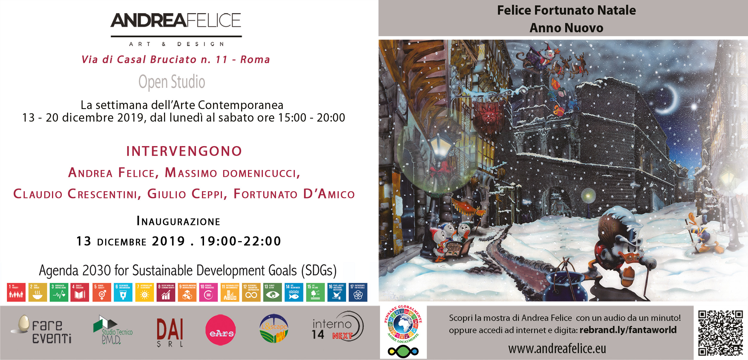 Venerdì 13 dicembre 2019 alle ore 19.00 inaugura la mostra Felice Fortunato Natale Anno Nuovo di Andrea Felice, a cura di Fortunato D’Amico. In esposizione una raccolta di opere ed oggettistica appartenenti alla numerosa collezione dei lavori - Fantaworld - che Andrea Felice ha realizzato in questi anni di intensa attività rivolta all’arte, al design e all’architettura.
