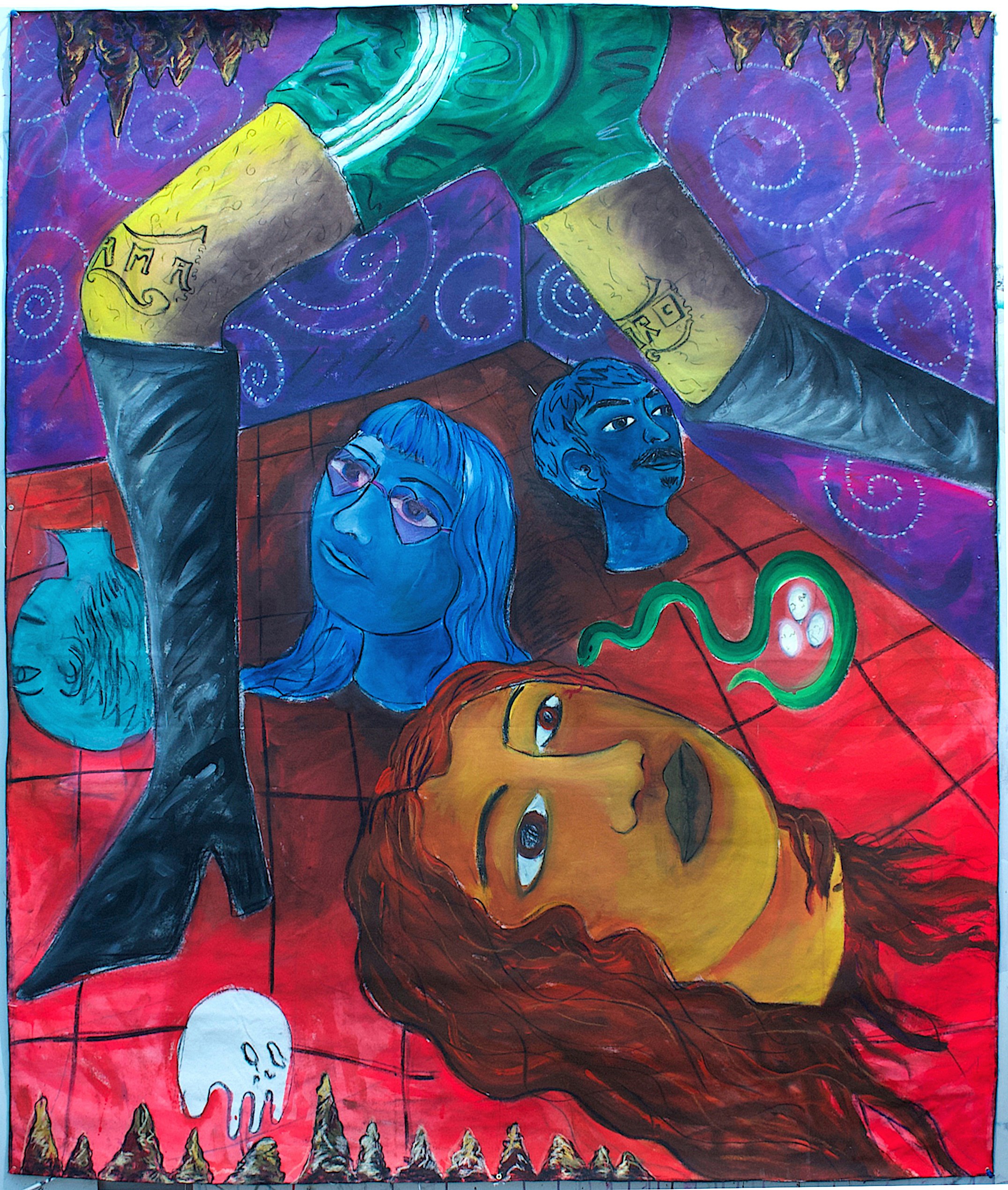 “Con le opere di ‘Amaro in bocca’ – spiega Andrea Fiorino – provo a raccontare ciò che può accadere durante un innamoramento e una delusione d’amore, in maniera ironica, a volte grottesca o spaventosa”. Costruita come una sequenza narrativa, la mostra racconta una storia attraverso varie scene, istantanee di un corteggiamento senza idealizzazioni, in cui si ritrovano gli stessi protagonisti, tela dopo tela, scena dopo scena, a condividere uno spazio di seduzione, stupore e mistero. “Tele di grandi dimensioni che occupano lo spazio in maniera prepotente e arrogante con il colore e il segno che le caratterizza – prosegue l’artista – si sparpagliano nell’ambiente e la casa fa da scenario a eventi che seguono un unico filo narrativo, dove personaggi e situazioni si ripetono come in un flusso di coscienza. Gli avvenimenti che ho rappresentato accadono tutti in un arco temporale contenuto, come se fossero scene del racconto di una notte soltanto. Spunti narrativi e immagini racchiudono in sé diversi livelli di lettura possibili. Senza che vi sia un unico finale precostituito”.