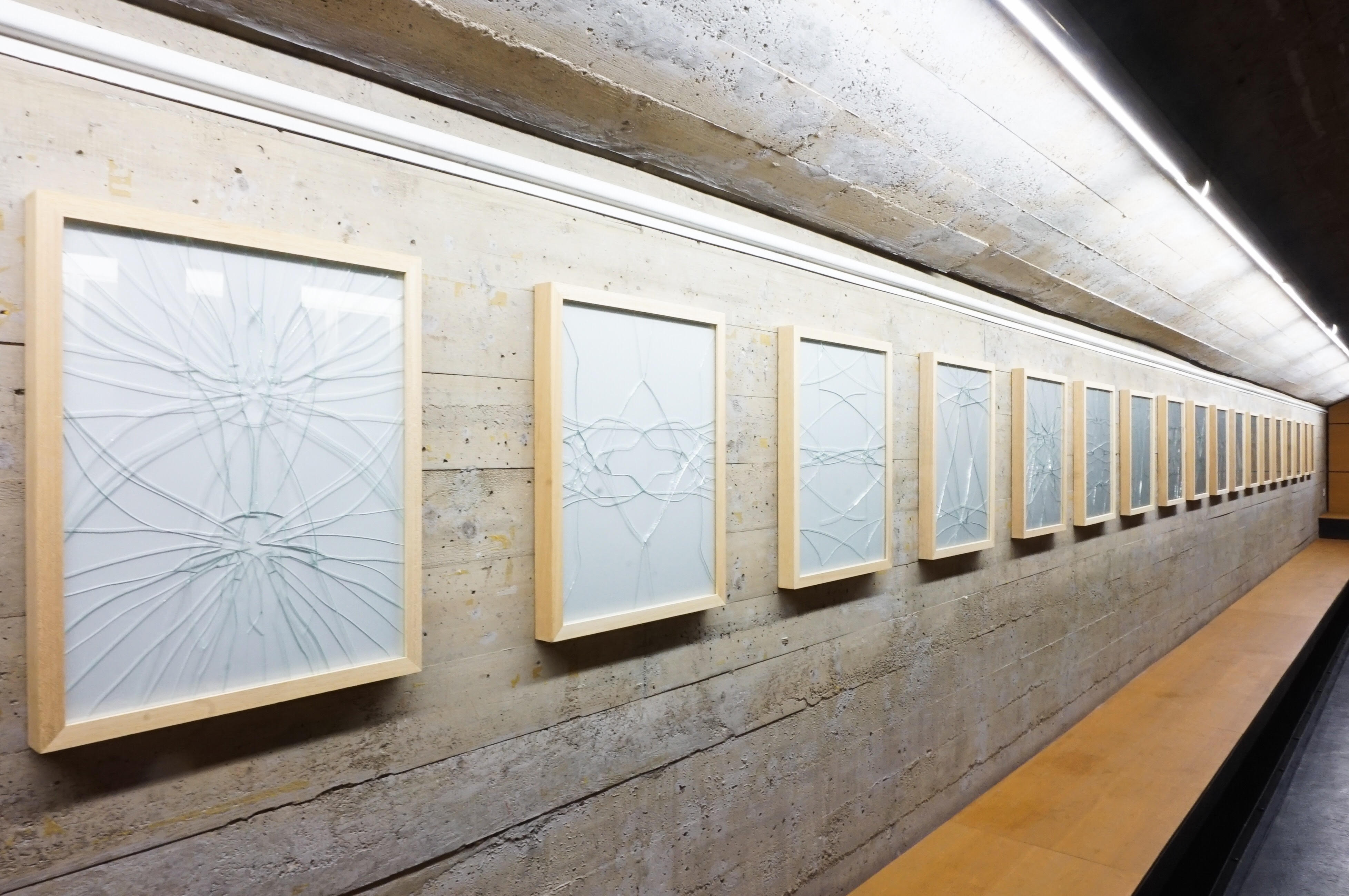 Vetri, cornici in legno con vetro, 36 elementi, ciascuno composto da un vetro rotto casualmente e tre vetri intagliati a mano disposti in quattro versi differenti, 47, 9 x 37,8 cm; misure complessive 300x230 cm circa.