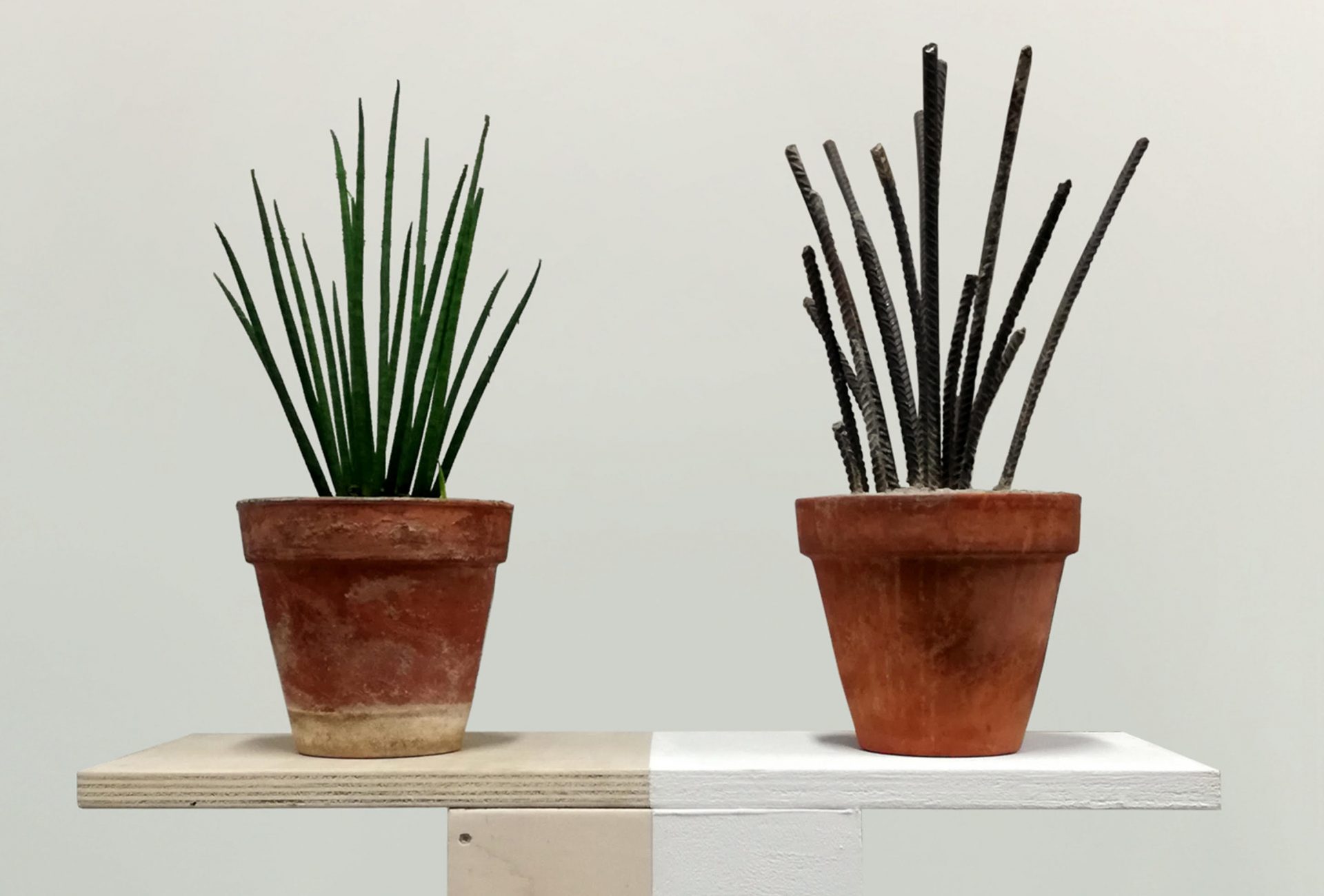 Sansevieria, vasi di terracotta, terra, tondini di acciaio per calcestruzzo, legno naturale e dipinto, dimensioni variabili.