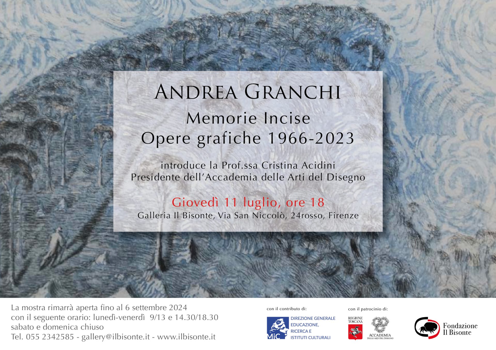 La Fondazione Il Bisonte è lieta di invitarLa all’inaugurazione della mostra personale di Andrea Granchi “Memorie Incise. Opere Grafiche 1966-2023”, che avrà luogo giovedì 11 luglio 2024, ore 18.00, presso la Galleria Il Bisonte (via S.Niccolò 24r, Firenze).
