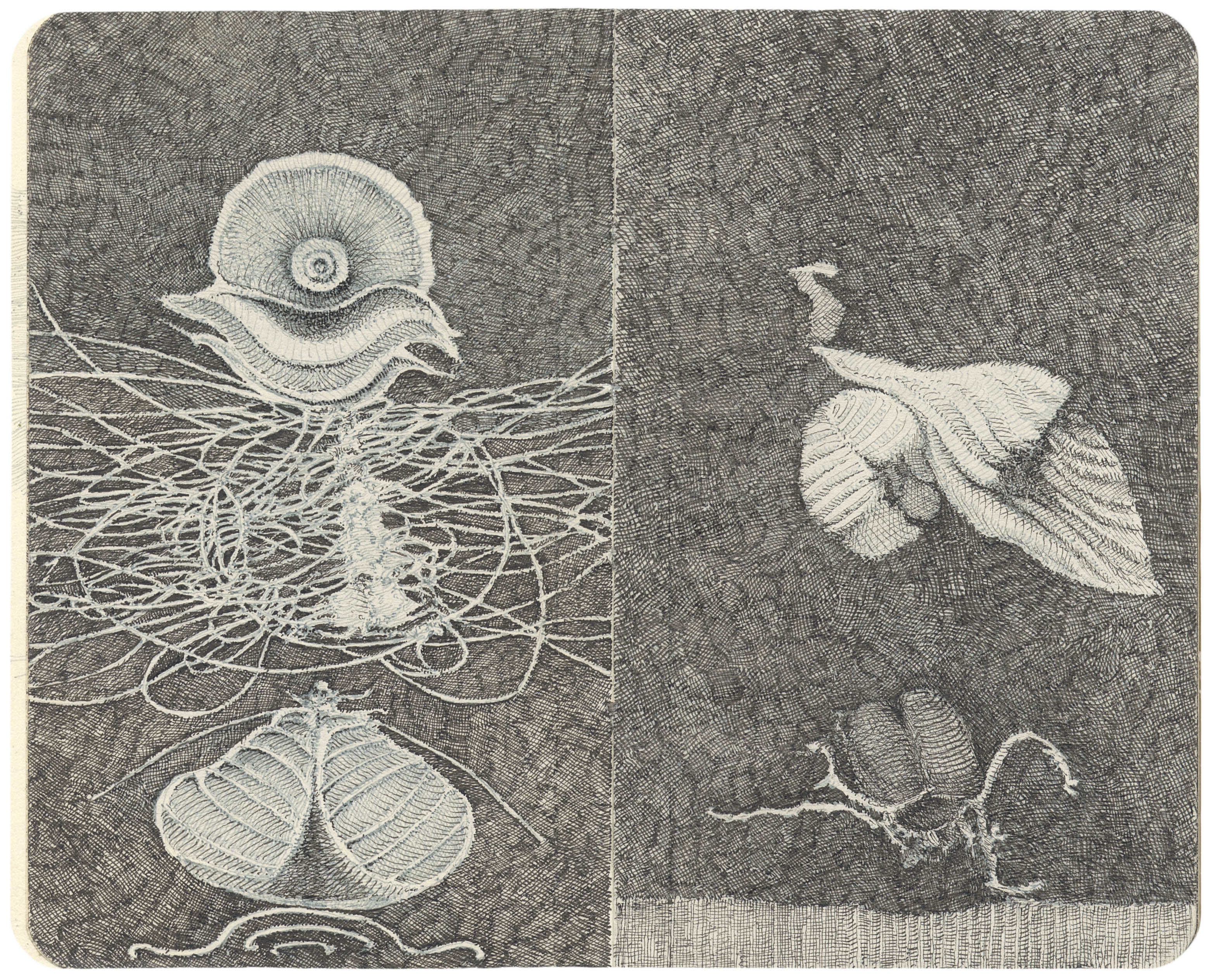 Il racconto attraverso le opere è come un itinerario alla scoperta di isole tematiche, il cui nucleo centrale è rappresentato dai taccuini, punto di congiunzione e scrigno di un immaginario che coniuga universo e mondo onirico, forme zoomorfiche e figure fantasmatiche.