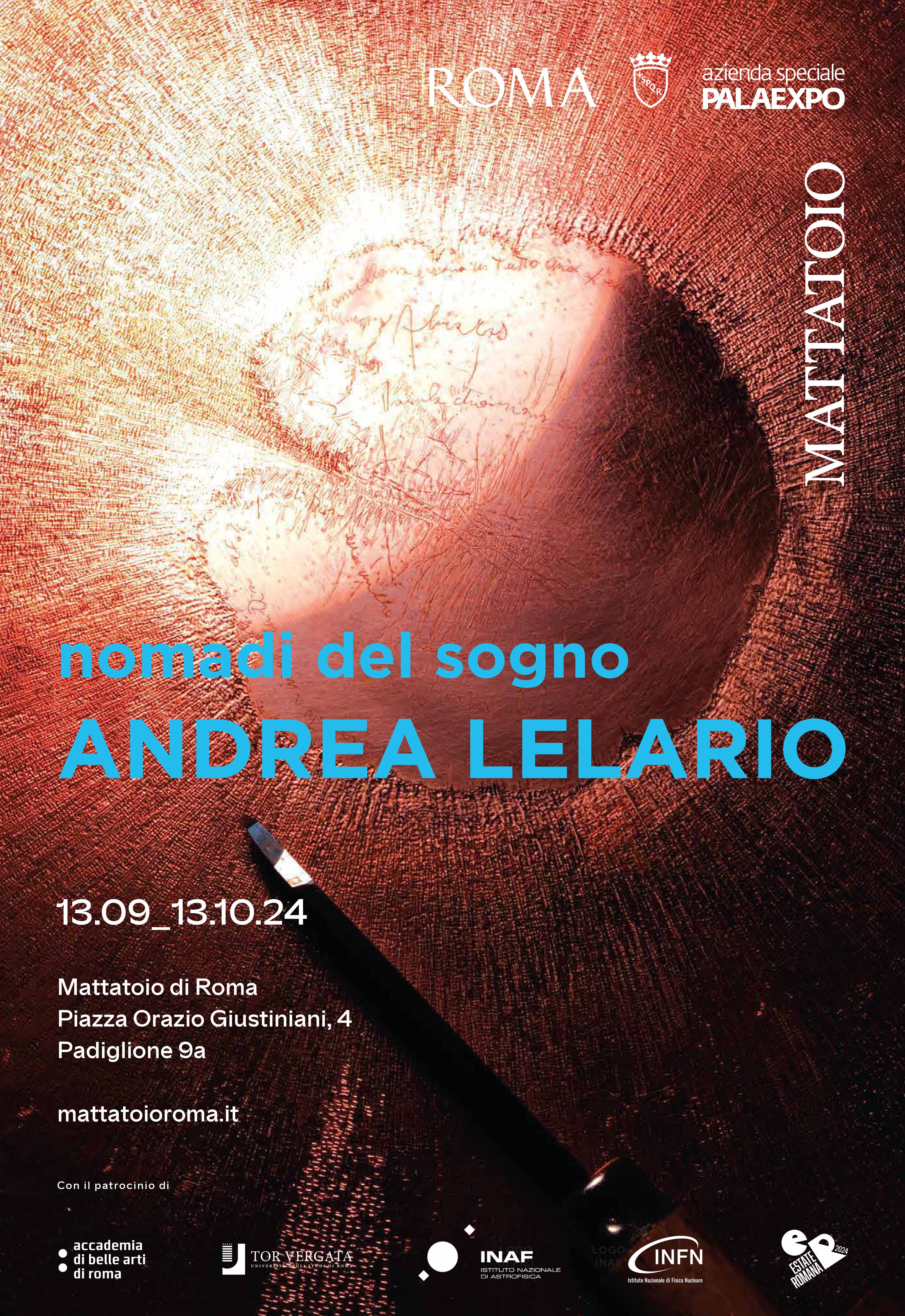 Dal 13 settembre al 13 ottobre 2024, il Padiglione 9a del Mattatoio di Roma ospita la mostra Andrea Lelario. Nomadi del sogno, promossa dall’Assessorato alla Cultura di Roma Capitale e Azienda Speciale Palaexpo, realizzata da Azienda Speciale Palaexpo in collaborazione con Untitled Group e con il patrocinio di Accademia di Belle Arti di Roma, Università di Roma “Tor Vergata”, Istituto Nazionale di Astrofisica, Istituto Nazionale di Fisica Nucleare.