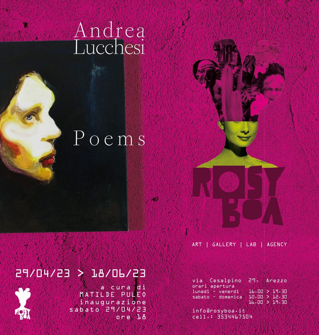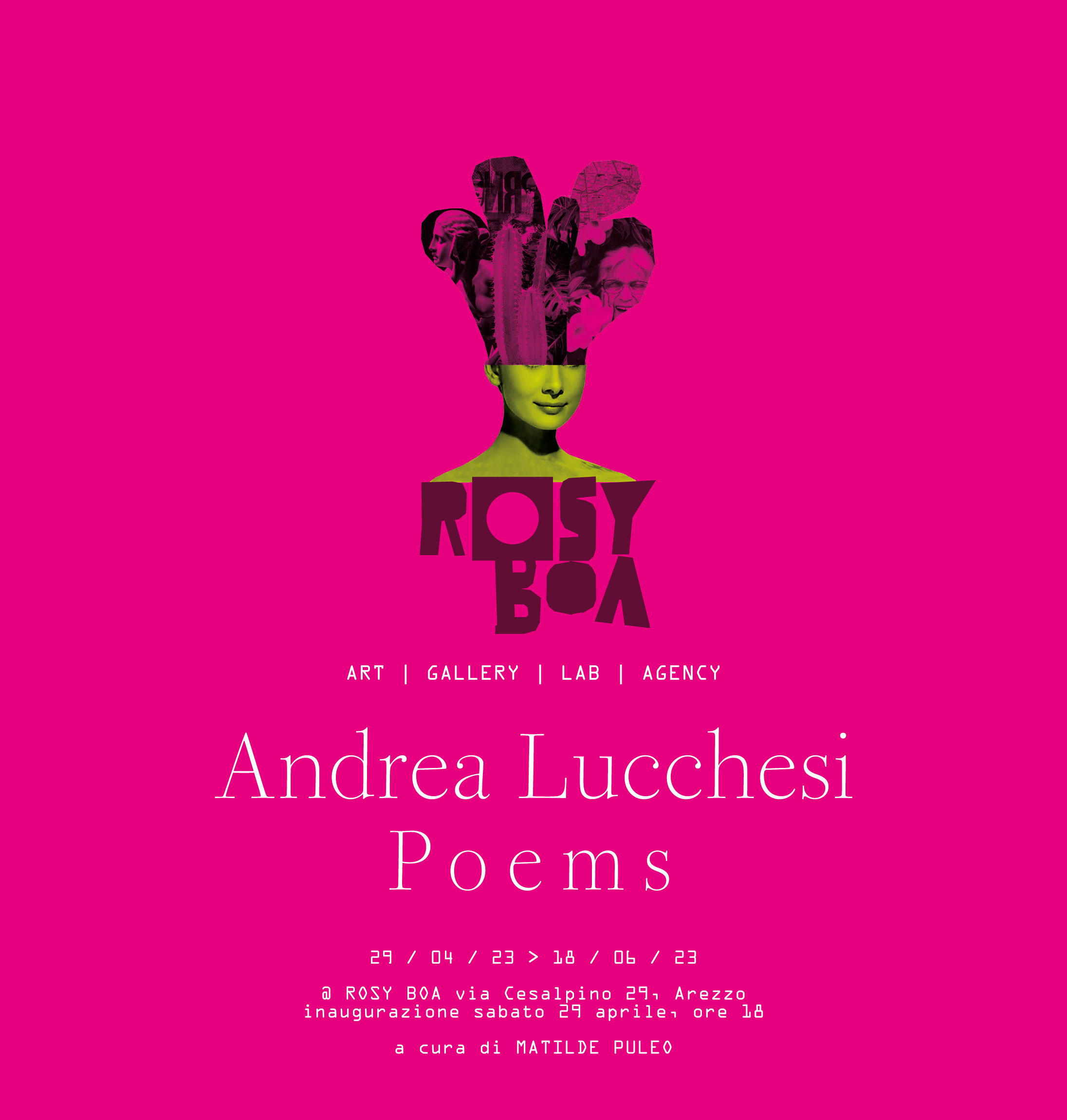 Rosy Boa è lieta di invitarvi sabato 29 aprile alla mostra personale dell’artista Andrea Lucchesi dal titolo “Poems”. Curata da Matilde Puleo, la mostra personale prende le mosse dall’ultima produzione artistica del giovane artista fiorentino, presentando un percorso che dal 2021 al 2023 lo ha visto impegnato in opere di piccolo formato. Con questo titolo Andrea Lucchesi racconta quella particolare attenzione che l’artista ha riservato alla zona di scambio fra poesia e arte visiva, intendendole “arti della visione”.