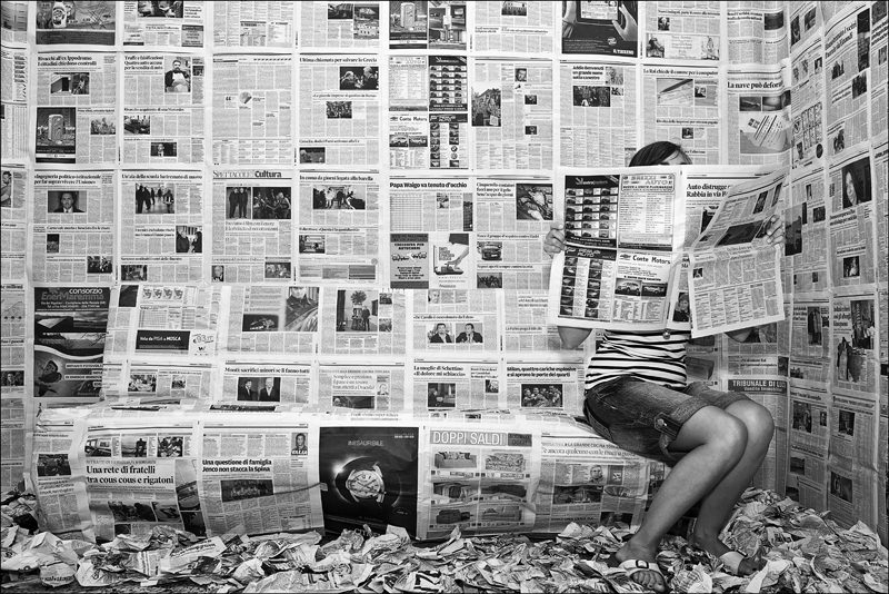 La Galleria EVENTI – trasfigurata in un’azione collettiva in ambiente multisensiorale – viene interamente ricoperta e saturata al suo interno da carta di giornale, video e files sonori che veicolano messaggi urbani pervasivi ed effimeri. “Files urbani” è un’opera d’arte ambientale “site specific”..